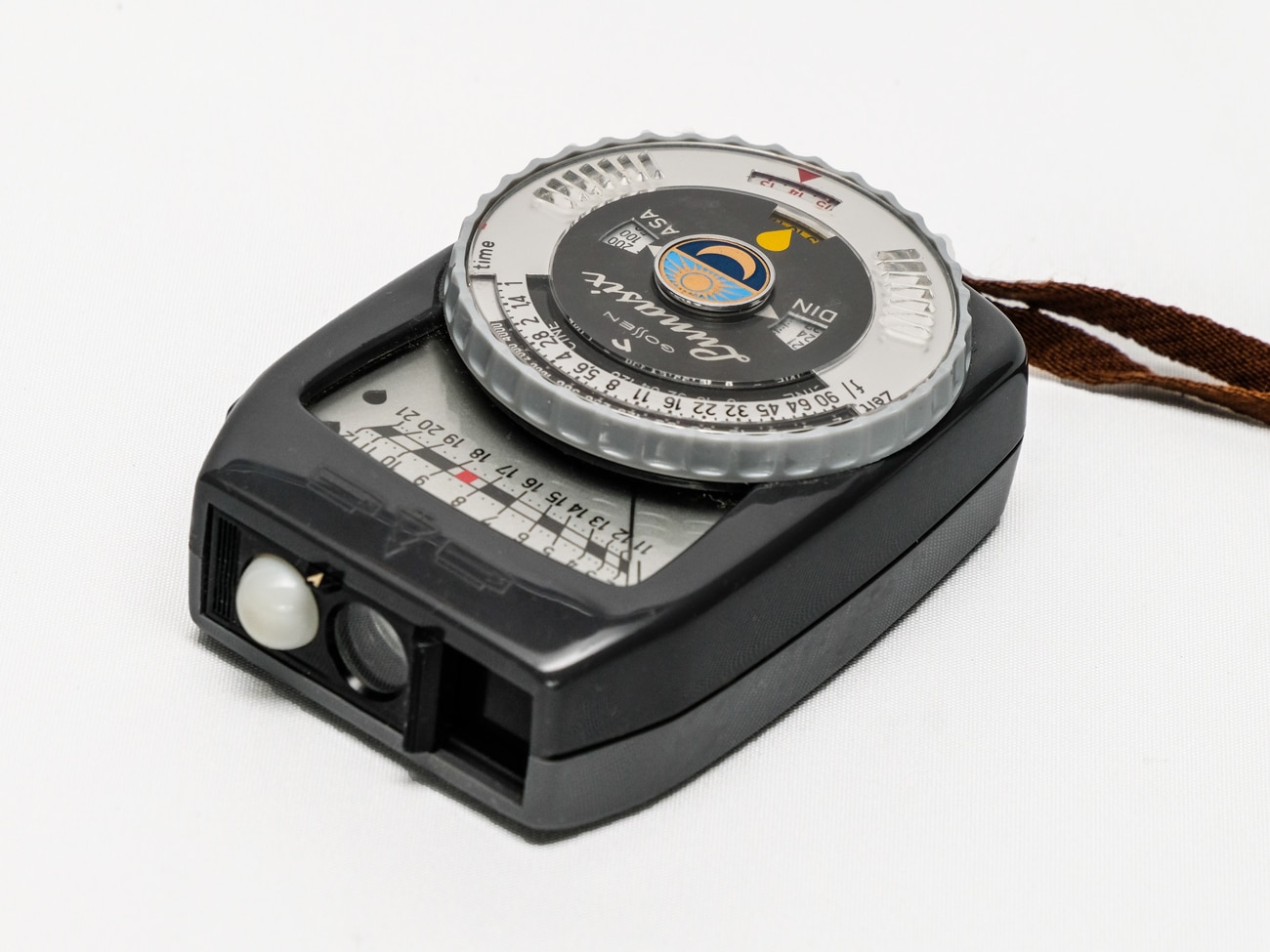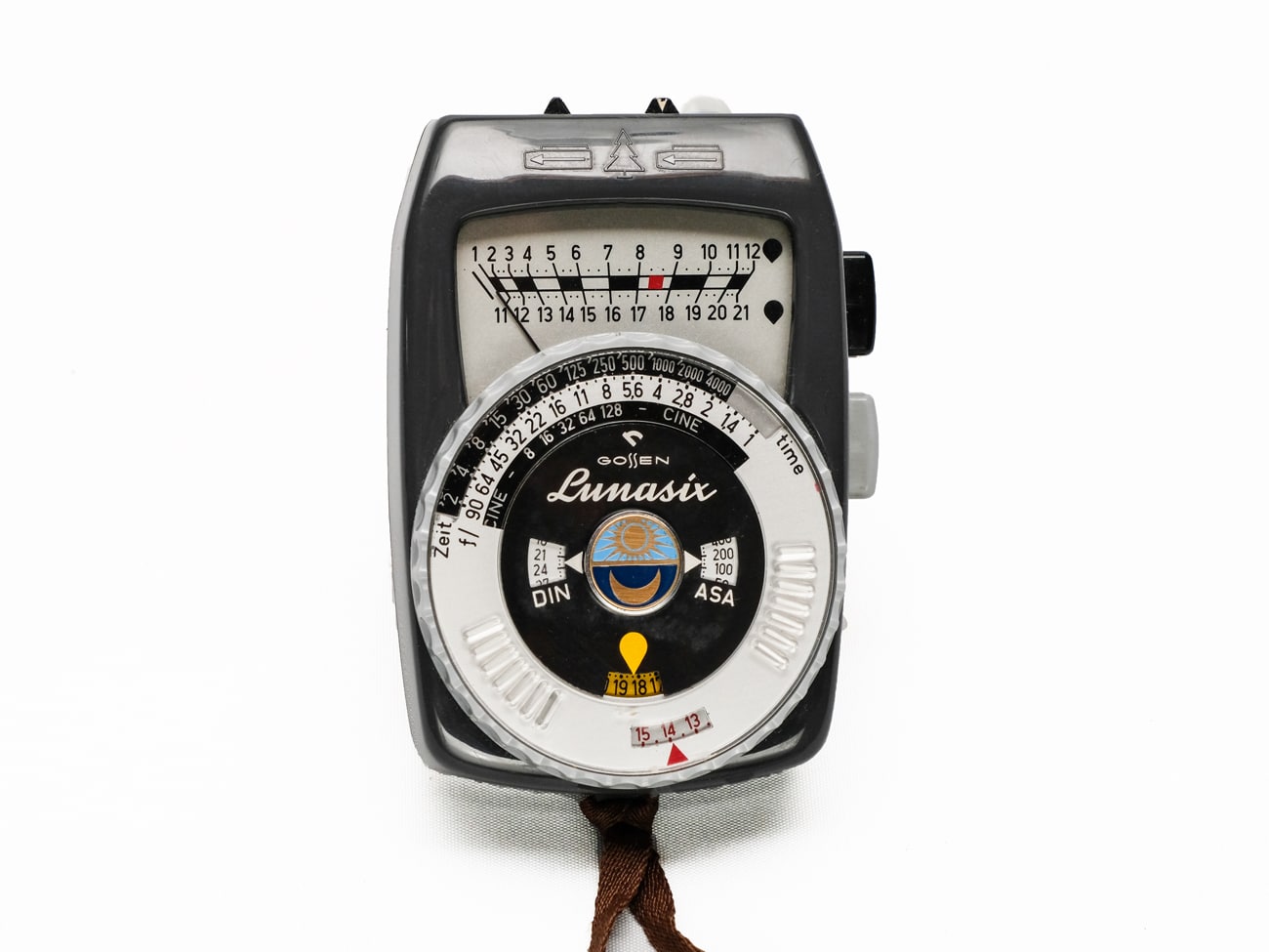 Elektronischer Belichtungsmesser mit CdS-Meßzelle von Gossen, Erlangen, ab etwa 1960. Der CdS-Fotowiderstand ändert unter Lichteinwirkung seinen Widerstandswert und ermöglicht auf einem Zeigerinstrument die Anzeige der Helligkeit. Zum Betrieb ist eine zusätzliche Stromquelle (zum Beispiel Mallory PX 13) erforderlich. Gegenüber der Selenzelle weist das CdS-Prinzip eine deutlich höhere Messempfindlichkeit auf. Die Zeigerskala ist in 2 Bereiche aufgeteilt: oben Skalenwerte 1 bis 12, unten Skalenwerte 11 bis 21. Der Messvorgang wird durch Druck auf eine der seitlichen Tasten ausgelöst, abhängig von der Motivhelligkeit. Der angezeigte Wert wird dann mit der Drehscheibe auf der unteren gelben Skala eingestellt, danach können auf den oberen Skalen der Drehscheibe die Belichtungswerte abgelesen werden: Blendenwerte 1 bis 90, Belichtungszeiten 1/4.000 Sekunde bis 8 Stunden, Filmempfindlichkeiten DIN 9-42/ASA 6-12.000, Bildfrequenzen für Filmaufnahmen 8 bis 128 Bilder/Sekunde. Am unteren Rand der Drehscheibe sind auch EV-Werte -8 bis +23 ablesbar. Neben der Objektmessung ist durch vorschieben einer Kalotte auch Lichtmessung möglich.