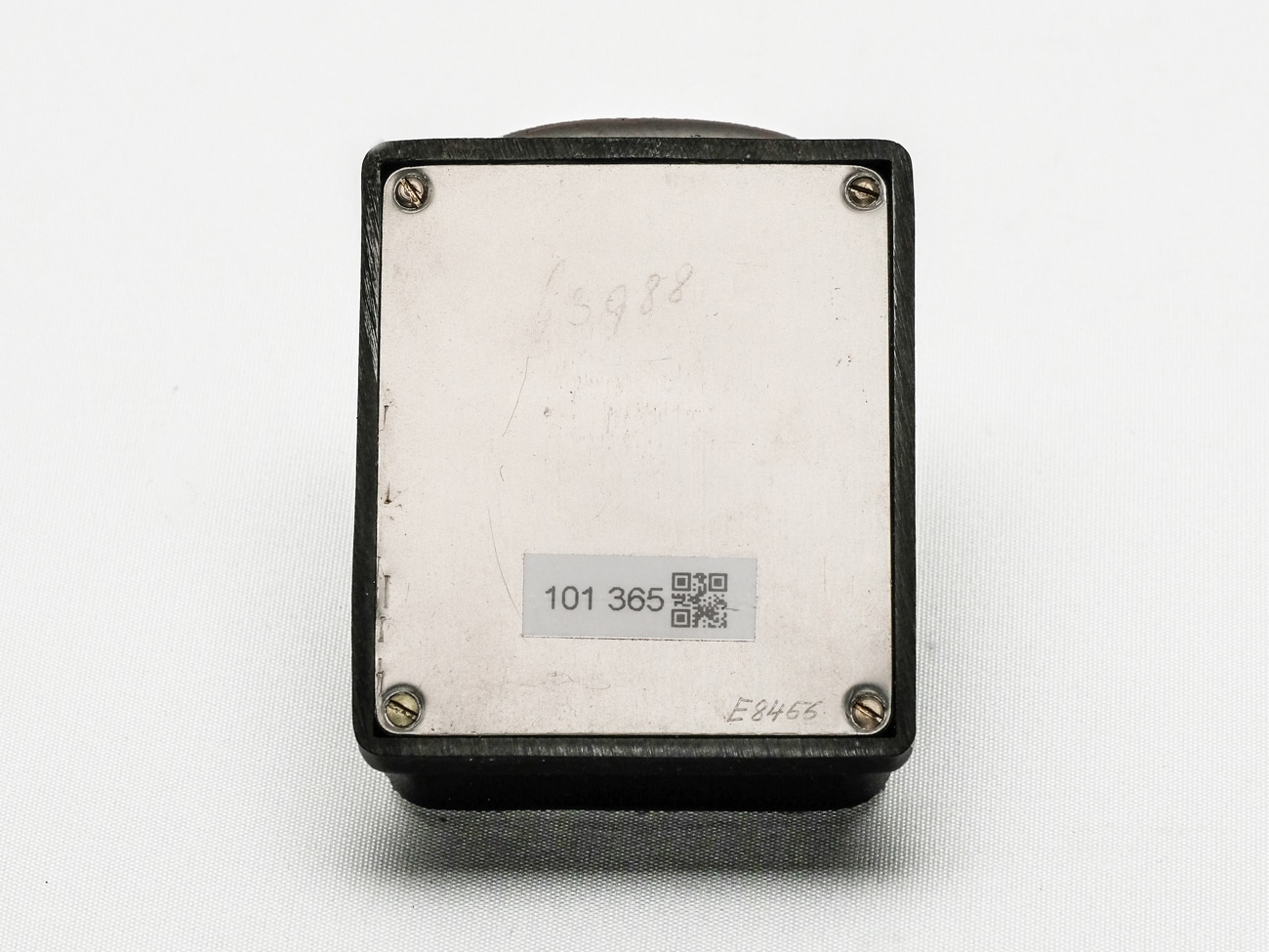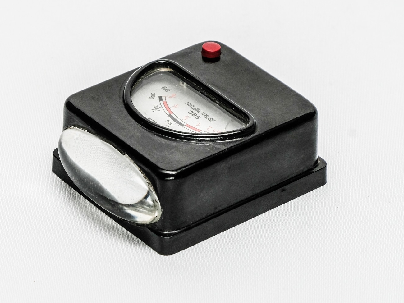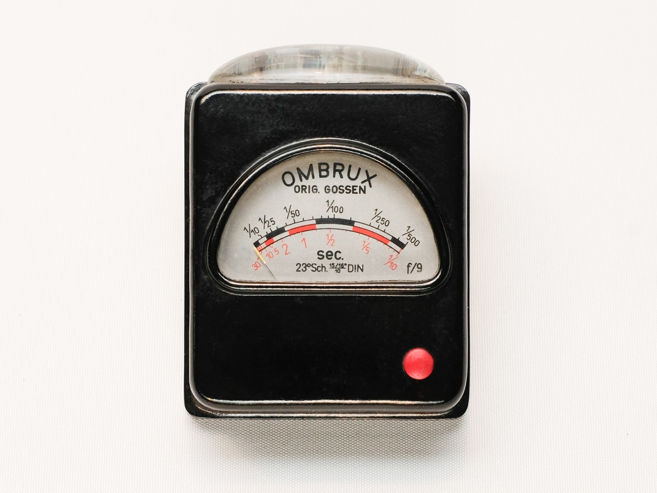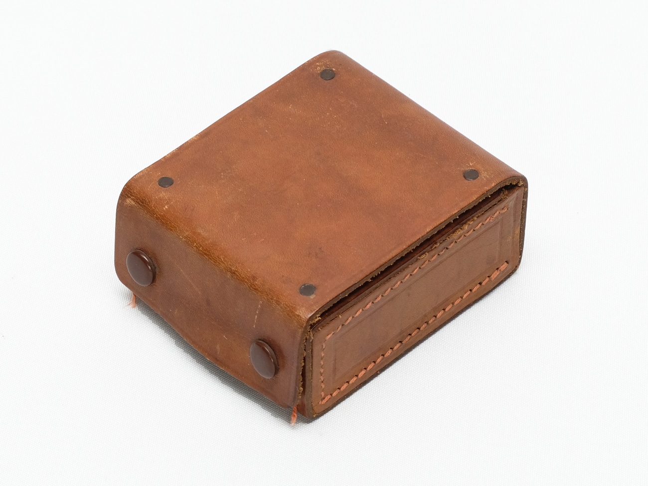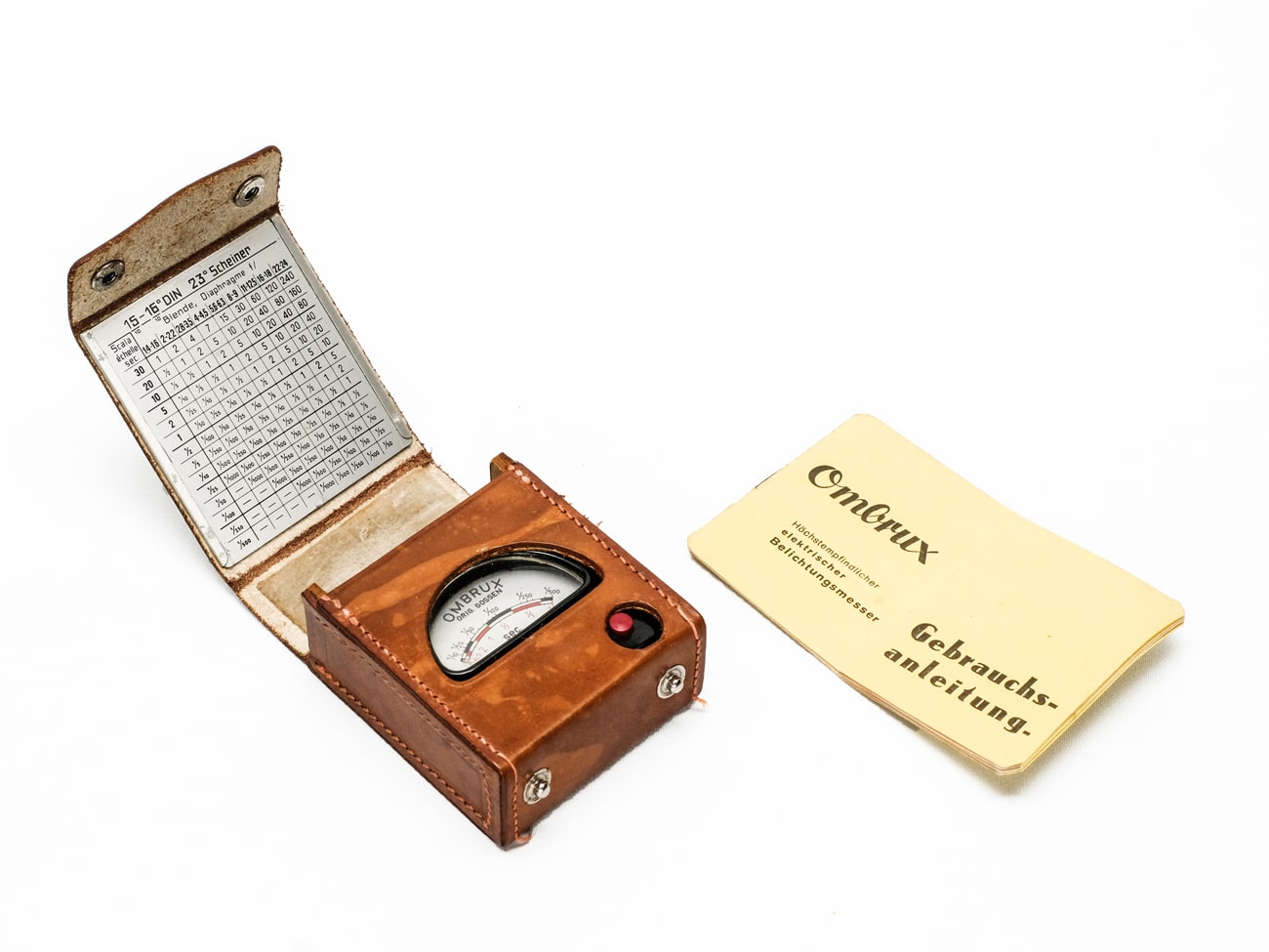 Belichtungsmesser mit Selen-Fotozelle von Gossen, Erlangen, ab etwa 1934. Dieses Modell wurde mehrfach geringfügig modifiziert. Die Beschriftung der Skala und die beigefügten Umrechnungstafeln sind unterschiedlich, die Bedienungsanleitung auf der Rückseite entfiel und die Seriennummer ist anders strukturiert (Hier: E8456). Die Selen-Zelle erzeugt bei Lichteinfall einen elektrischen Strom, abhängig von der Helligkeit; eine Stromquelle ist nicht erforderlich. Die Skala des angeschlossenen Zeigerinstruments ist in zwei Bereiche geteilt: den Langzeitbereich mit 30 Sekunden bis 1/10 Sekunde (rot) und den Kurzzeitbereich mit 1/10 Sekunde bis 1/500 Sekunde (schwarz). Die Umschaltung erfolgt mit dem roten Knopf auf der Oberseite. Die Anzeigewerte gelten für Blende 1:9 und eine Empfindlichkeit von 23 Grad Scheiner (15/16 DIN), für andere Einstellungen sind Metalltafeln mit Umrechnungstabellen beigefügt.