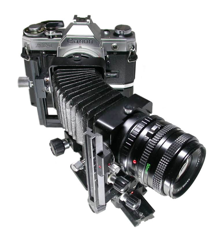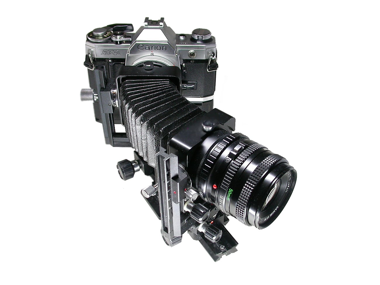 Heute eher selten anzutreffen: Mit diesem Balgengerät der Firma Hama wurde die Kleinbildkamera innerhalb enger physikalischen und mechanischen Grenzen zu einer Fachkamera mit Tilt- und Shift-Möglichkeit – theoretisch wenigstens. In der Praxis erwiesen sich viele dieser nicht gerade billigen, dafür aber zigfach verstellbaren Balgengeräte als etwas wackelig. Und so wurden sie in der Regel fast nur für Makroaufnahmen benutzt. Der Balgen ist hier montiert an einer Canon AE 1 von 1976; das 50-mm-Objektiv ist nur symbolisch für das Foto angebracht.