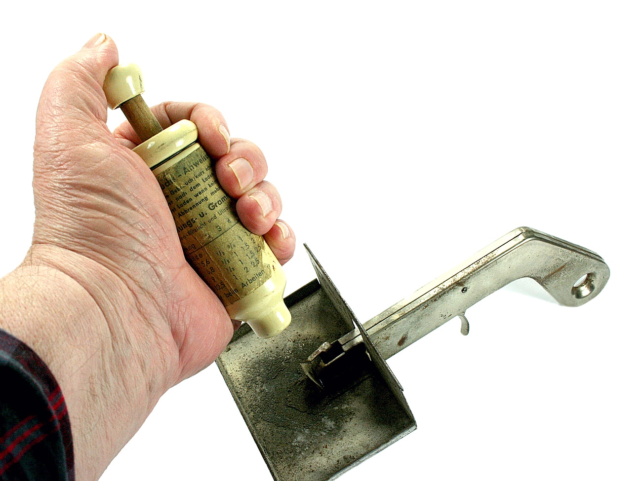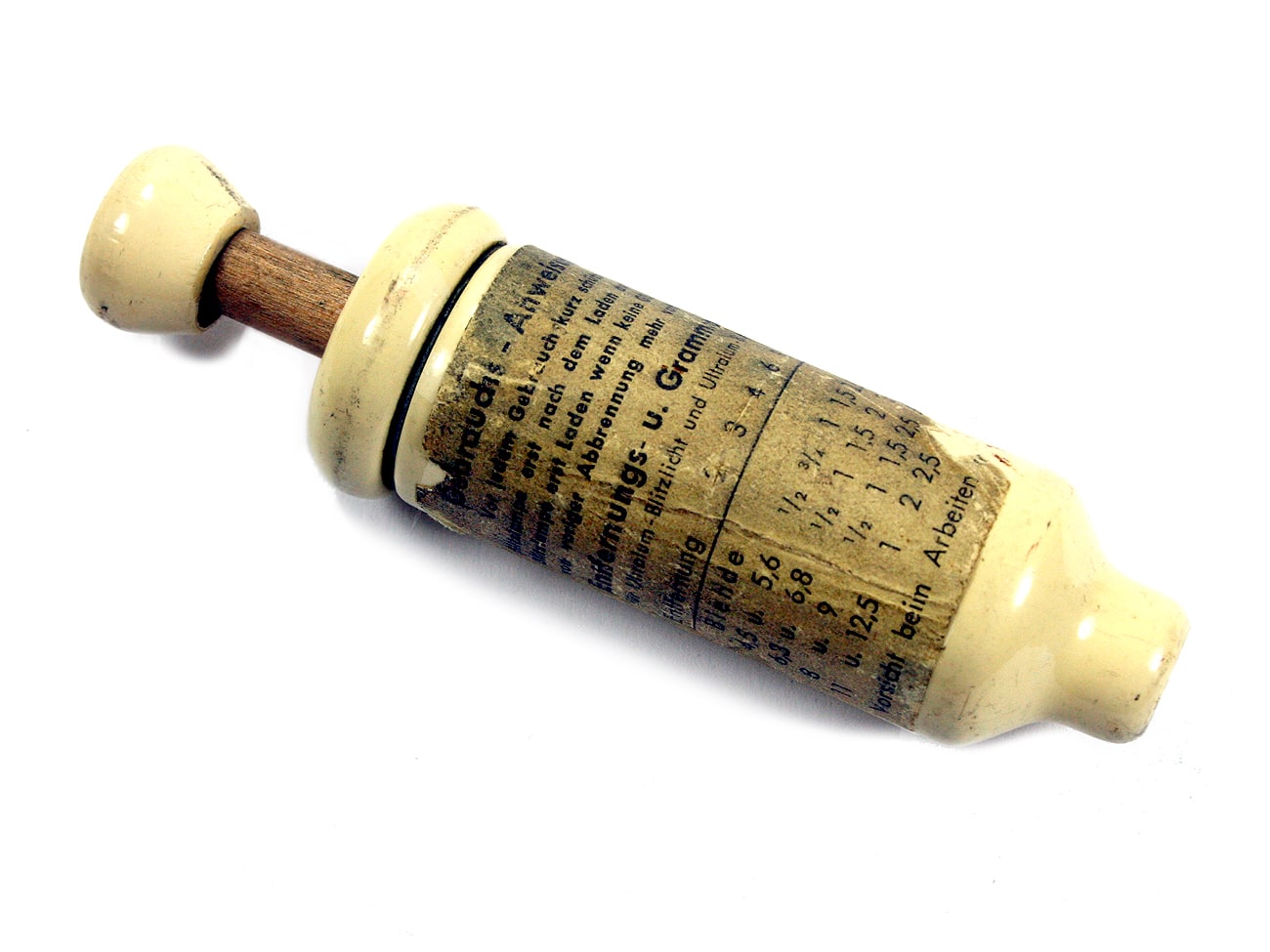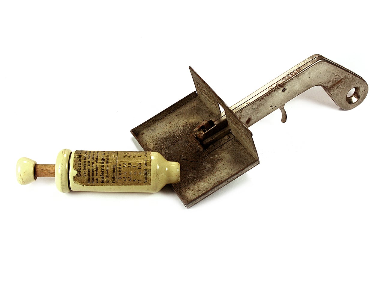 Das abzuschätzen war mit diesem Dosiergerät eines nicht näher bezeichneten deutschen Herstellers möglich: Eine aufgedruckte Tabelle gab an, wie viel Gramm Blitzpulver für welche Blende bei welcher Aufnahmeentfernung nötig waren. Und entsprechend oft musste der Fotograf den Drücker betätigen, der immer eine genau definierte Menge des Blitzpulvers freigab. Laut Aufschrift war dieses Dosiergerät ursprünglich für die Ultralum-Blitzgeräte von Hama gedacht, könnte also von Hama stammen.