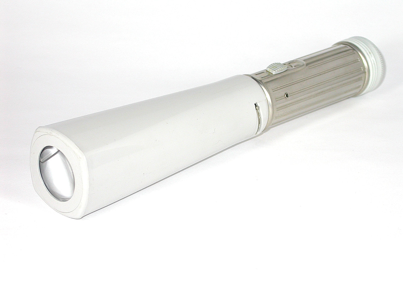 Zeigegerät der Firma Hama für Dia- oder Filmvorträge aus den Siebziger Jahren, Made in Germany, projiziert eine punktförmige Markierung auf die Leinwand, Schärfejustierung an dem vorderen grauen Rohrstück. Stromversorgung: 2 x Monozellen je 1,5 Volt.