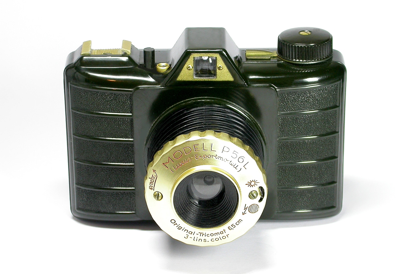 Bakelit-Kamera für den Rollfilm 120 (Negativformat 6 x 6 cm) mit versenkbarem Objektivtubus (Schraubgewinde), Baujahr 1956. Objektiv: „Original-Tricomat 6,5 cm 3-lins. color“ (1:8/65 mm). Newton-/Fernrohrsucher. Einfachverschluss. Versenkter Zubehörschuh. Hergestellt von der „Apparatebau und Kamerafabrik“ mit Sitz in Monheim unter Lizenz von Pouva (Karl Pouva, Freital bei Dresden). Das Unternehmen war Mitte der 1950er Jahre aktiv und produzierte hauptsächlich Bakelit- oder andere Kunststoffkameras. Vertrieb: Hamaphot (später: Hama), Monheim.