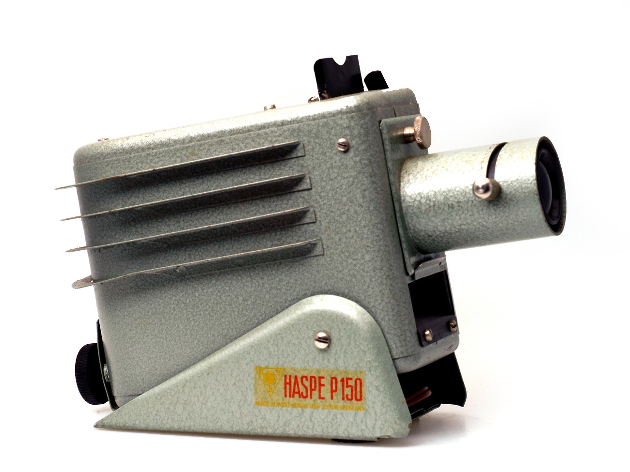 Ungewöhnlich designeder, einfacher Diaprojektor (Kleinbild 5 x 5 cm) des West-Berliner Herstellers Hans Sperling (Marke: Haspe), 1950er Jahre. Metallgehäuse mit Hammerschlageffekt. Projektionsachse neigbar (Rändelschraube hinten). Einfaches Netzkabel ohne Zugentlastung. Objektiv Dinar: 1:2,8/85 mm. Kein Gebläse.