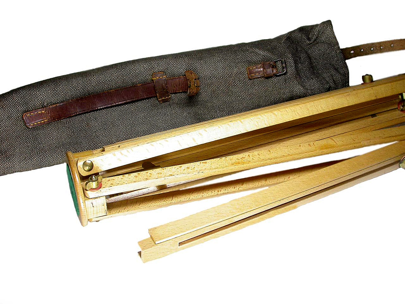 Wunderschön präzise gearbeitetes Holzstativ, mehrfach ausklapp- und ausziehbar bis auf eine Höhe von etwa 125 Zentimeter; Kamera-Auflagefläche mit grünem Filz bezogen. Vermutlich aus den 1930er Jahren, aber in dieser Form auch in der Nachkriegszeit noch erhältlich. Dazu gehört eine etwa 45 Zentimeter lange Tragetasche aus festem Stoff mit Verschlussriemen, Griff und Boden aus Leder.