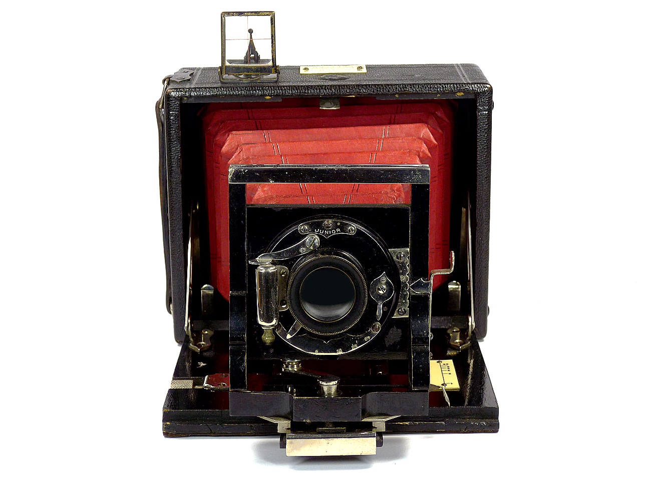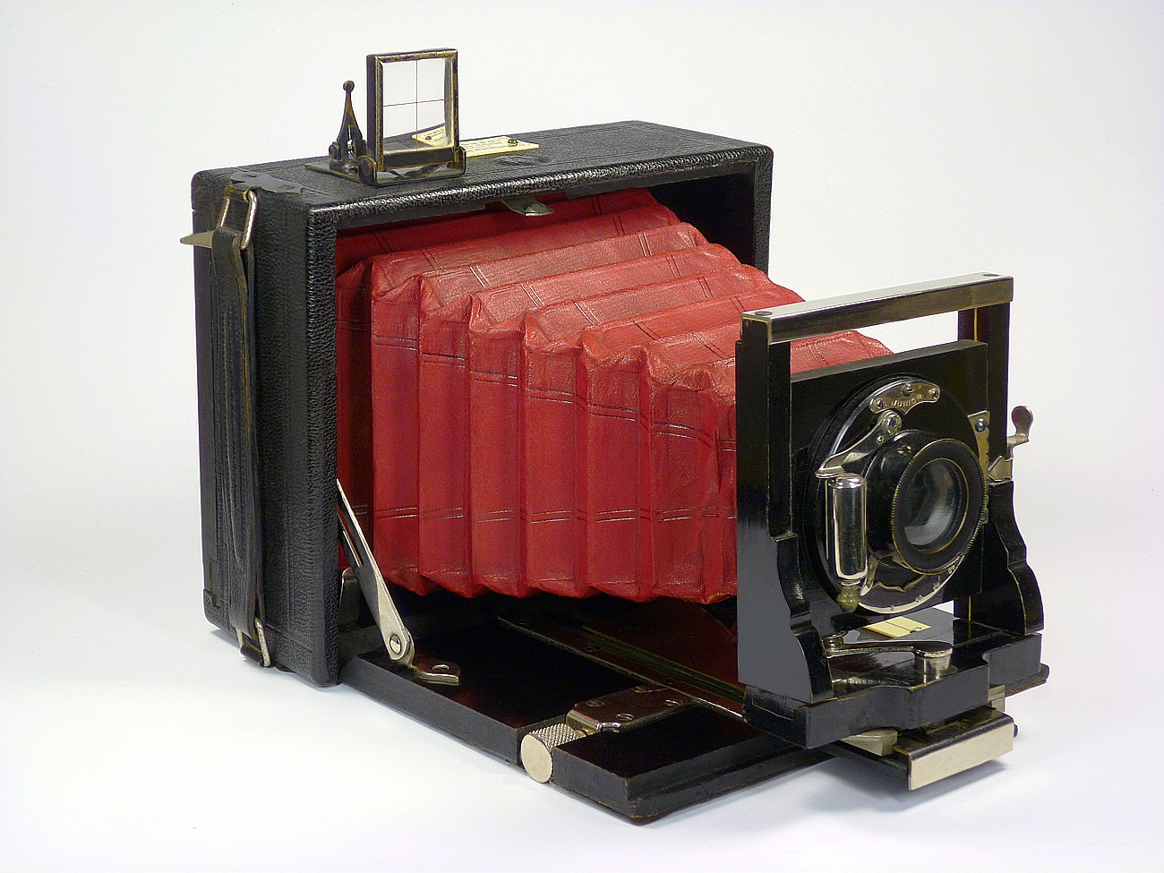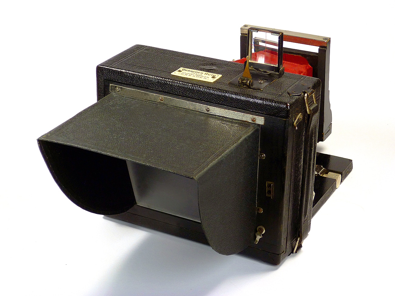 Unbezeichnete Plattenkamera, Alter unbekannt, vielleicht um 1900 bis 1910. Der Vorbesitzer datierte die Kamera auf 1895. Belege fehlen aber dafür. Doppelter Auszug, roter Lederbalgen, nach oben und unten verstellbare Frontplatte, Frontstandarte lässt sich auch nach links und rechts verschieben. Junior-Verschluss mit B-, T- und Moment-Einstellung. Objektiv Wollensak (New York) mit der Lichtstärke 1:8. Stativgewinde seitlich und unten. Holzgehäuse, Tragegriff.