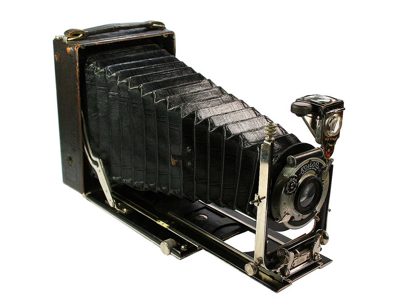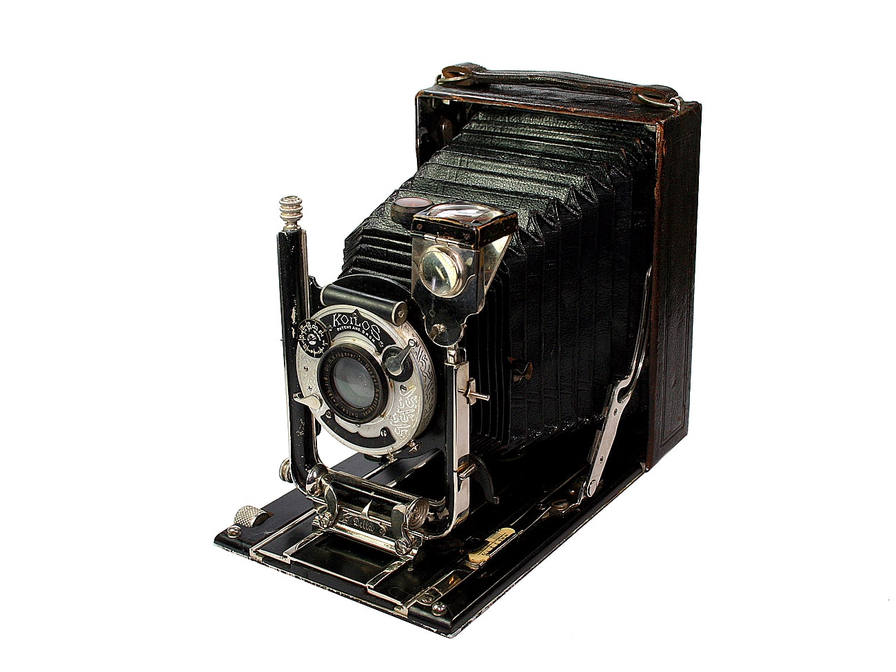 Klapp-/Laufbodenkamera für Platten oder Filmpacks (Aufnahmeformat 9 x 12 cm), hergestellt von Ica um 1910. Objektiv: Dr. R. Krügener’s Doppel-Anastigmat Delta 1:8,0/13,5 cm; manuelle Fokussierung mittels Laufboden. Schwenkbarer Brillantsucher mit Libelle. Mechanischer Zentralverschluss Koilos mit Luftbremse, hergestellt von Gauthier ab 1904 (T, B, 1 bis 1/300 Sekunde); manuelle Belichtungssteuerung. Doppelter Auszug; Standarte horizontal und vertikal verstellbar.