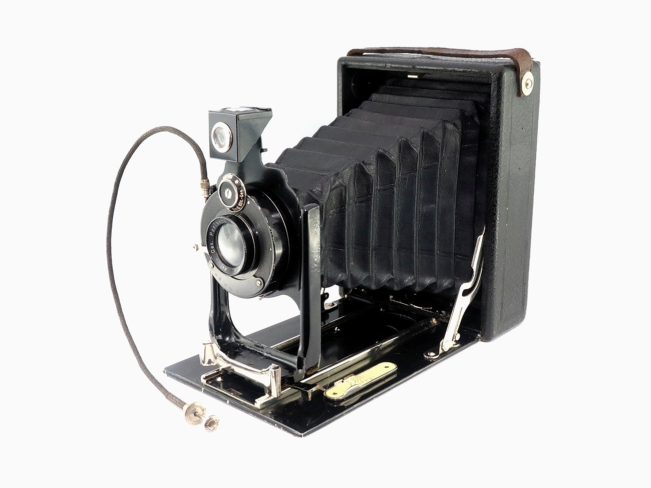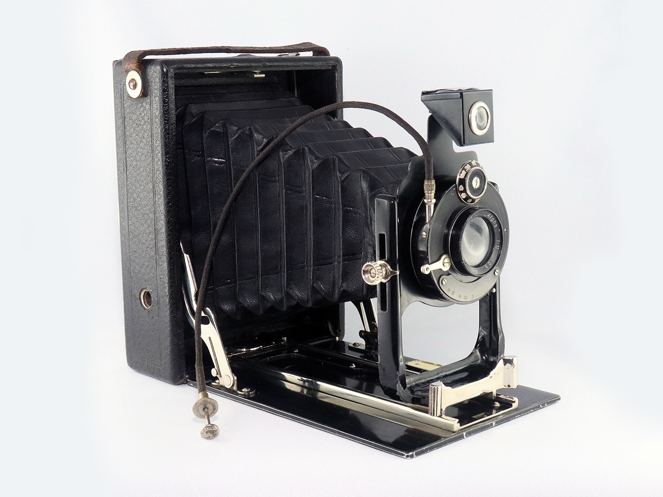 Sucherkamera (etwa 1910 bis 1915) von Ica für Platten oder Filmpacks (Aufnahmeformat 9 x 12 cm), manuelles Scharfstellen, mechanischer Zentralverschluss (Z, B, 1/25 bis 1/100 Sekunde), manuelle Belichtungssteuerung. Das Objektivteil (Objektiv: Ica Periscop Alpha 1:11) ist hoch und tief verstellbar und in jeder Lage zu befestigen. Der Brillantsucher lässt sich für Queraufnahmen umlegen. Das Gehäuse der Kamera ist aus Holz und mit Kunstleder bezogen. Der Laufboden (einfacher Auszug) besteht aus Leichtmetall und der Balgen aus Leder. Auf der Innenseite oben im Gehäuse befindet sich die kreisrunde Ica-Plakette.