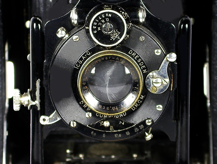 Klapp-/Laufbodenkamera für Platten oder Filmpacks (Aufnahmeformat 9 x 12 cm), hergestellt zwischen 1914 und 1927 von Ica, Dresden (1909 bis 1926), ehemals Hüttig, Dr. Krügener, Wünsche, Zeiss Palmos, ab 1926 Zeiss Ikon AG. Objektiv: ICA-Novar-Anastigmat 1:6,8/13,5 cm; manuelle Fokussierung mittels Verstellung des Laufbodens. Schwenkbarer Brillantsucher mit Libelle. Mechanischer Zentralverschluss Compound mit Luftbremse (B, Z, 1 bis 1/250 Sekunde); manuelle Belichtungssteuerung. Doppelter Bodenauszug, Zahntriebeinstellung, lederbezogenes Gehäuse aus Leichtmetall, Lederbalgen; hoch, tief und seitlich verstellbare Objektivstandarte. Metallkassetten zum Einschieben, Mattscheibenrahmen mit Kappe, Metallauslöser.
