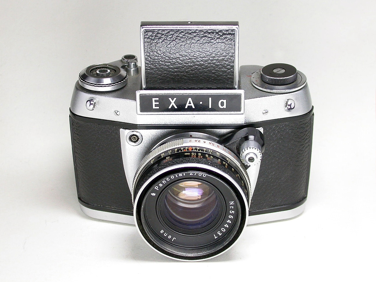 Beliebte einäugige Spiegelreflexkamera (SLR) für den Kleinbildfilm 135 (24 x 36 mm), hergestellt von VEB Pentacon in Dresden, DDR, von 1965 bis 1977. Für Wechselobjektive mit Exakta-Bajonett (hier mit Pancolar 1:2,0/50 mm aus Jena); manuelle Fokussierung. Lichtschachtsucher mit einschwenkbarer Lupe. Klappverschluss (B, 1/30 bis 1/175 Sekunde); manuelle Belichtungssteuerung. Manueller Filmtransport mittels Schnellspannhebel. Diese Kleinbildkamera war übrigens auch für das interessante Revue-Unterwassergehäuse vorgesehen.