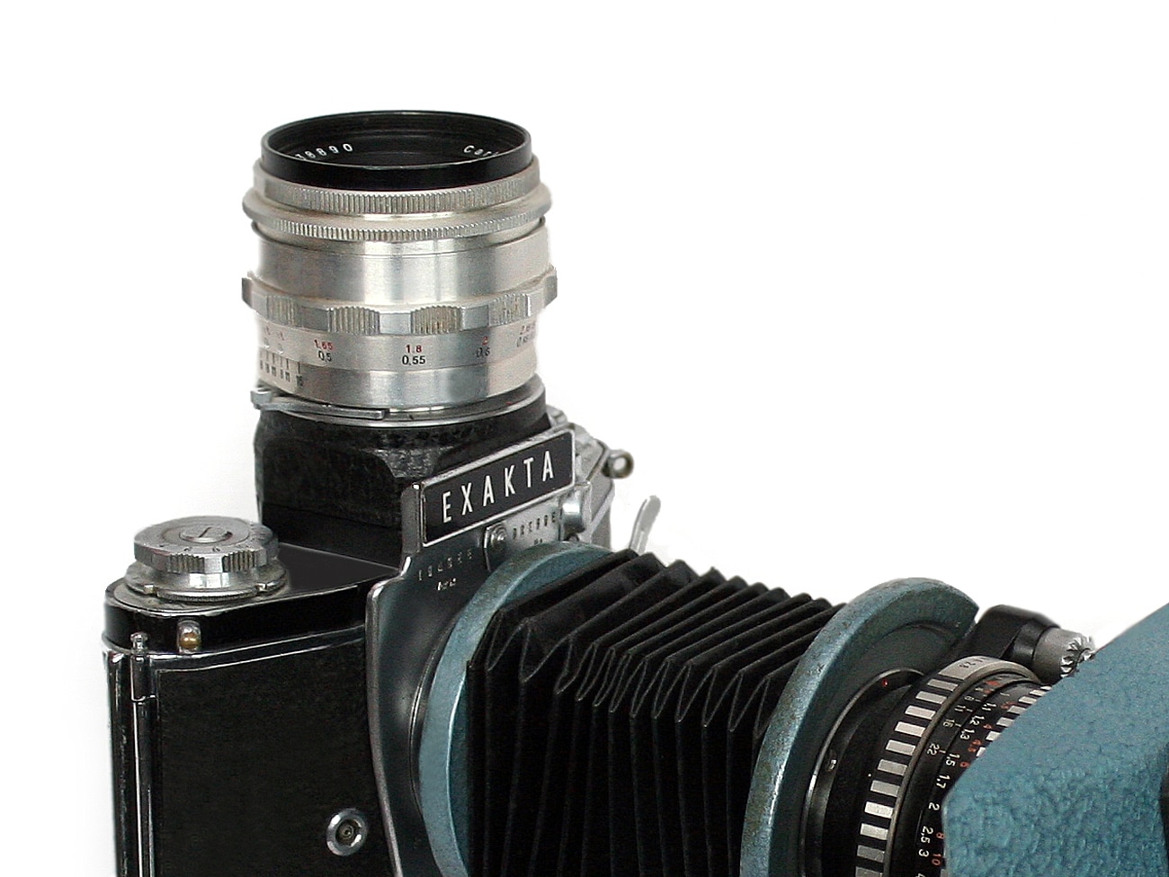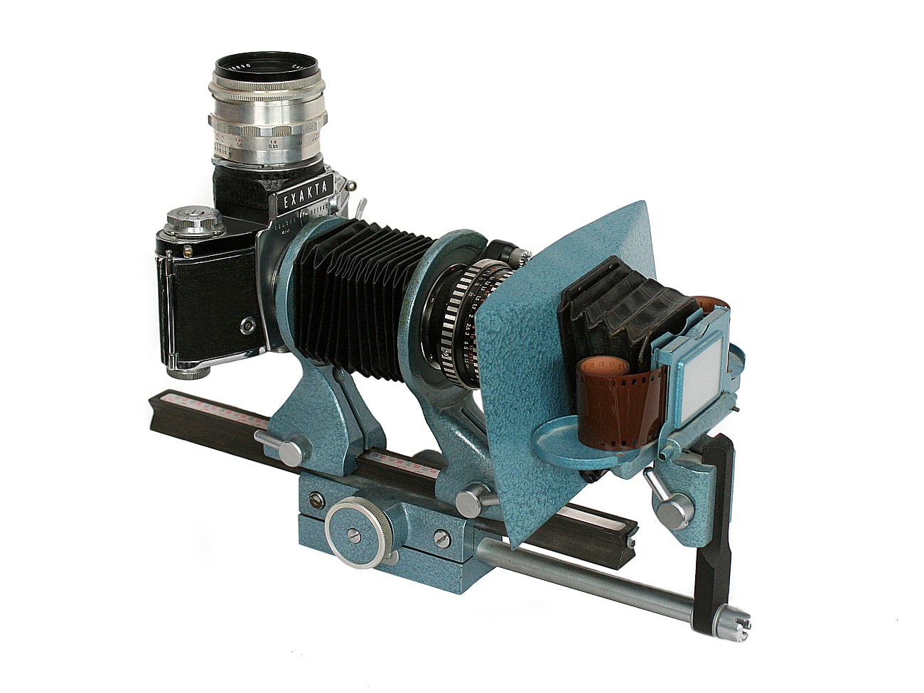 Die Exakta war eine absolute Systemkamera mit vielen An- und Ausbauteilen. Im Bild beispielsweise mit Balgen und Diakopiereinrichtung nebst Kompendium. An Stelle des Lichtschachtes oder Prismeneinsatzes konnte bei Makro- und Mikroaufnahmen für eine bessere Schärfeeinstellung des Sucherbildes auch der Ihagee-Objektivlupeneinsatz verwendet werden. Die über das Exakta-Bajonett angeschlossene Objektivlupe lässt sich problemlos durch ein besser korrigiertes Kameraobjektiv (siehe Bild) ersetzen. Hier mit Carl Zeiss Jena Biotar 1:2,0/85 mm Seriennummer 3838890.