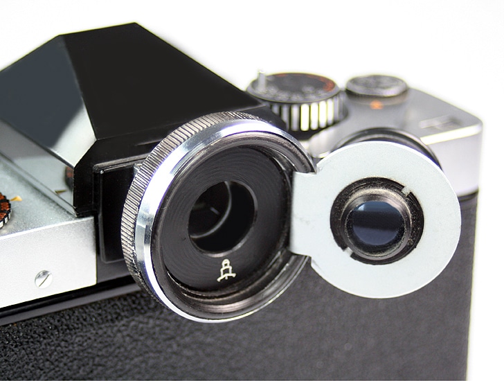 Okularlupe zur Exakta. Dioptrien einstellbar, Lupe kann weggeklappt werden, dann ist das normale Sucherbild sichtbar.