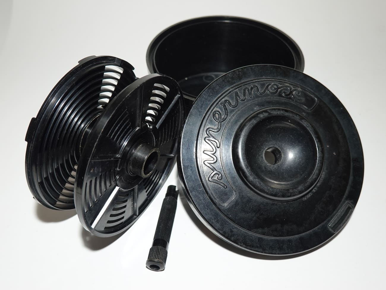 Entwicklungsdose aus Bakelit für den Kleinbildfilm 135, hergestellt in Frankreich. Bestehend aus Dose, Deckel, Spiraleinsatz und Drehstab. Im Museum mit der originalen Gebrauchsanleitung in französischer Sprache.