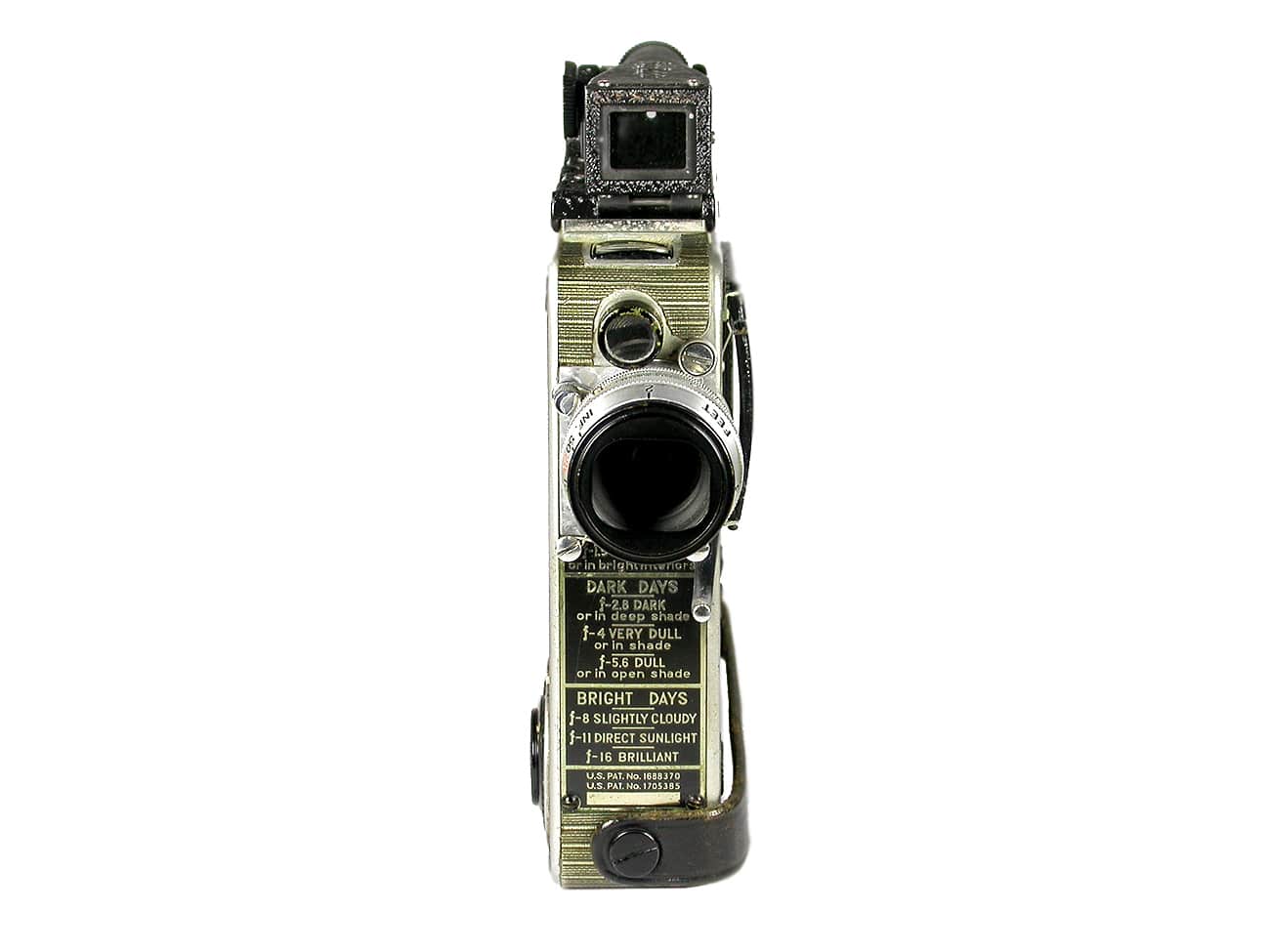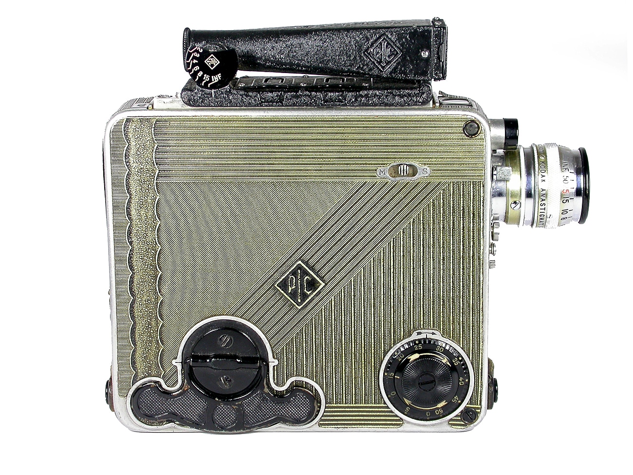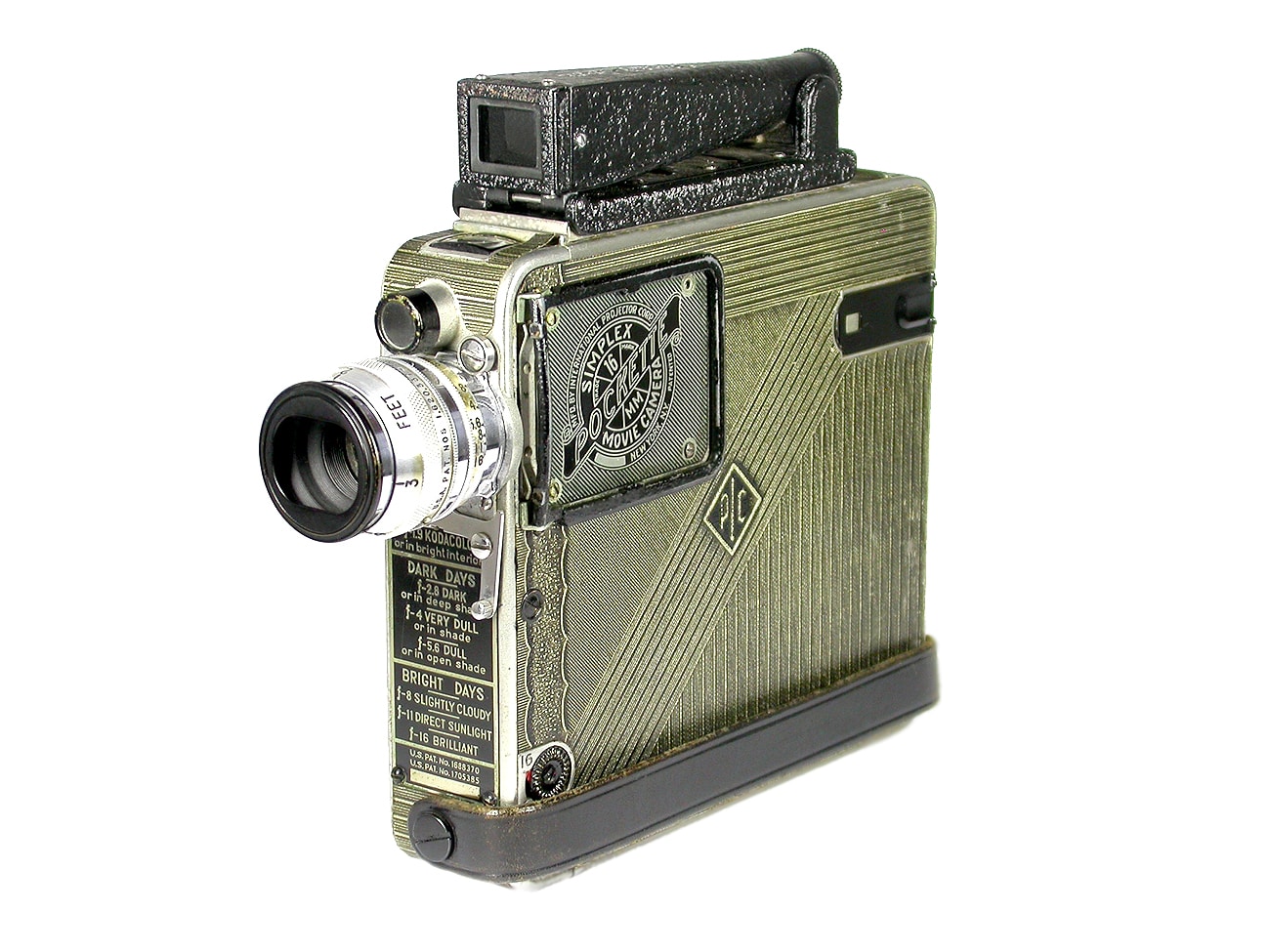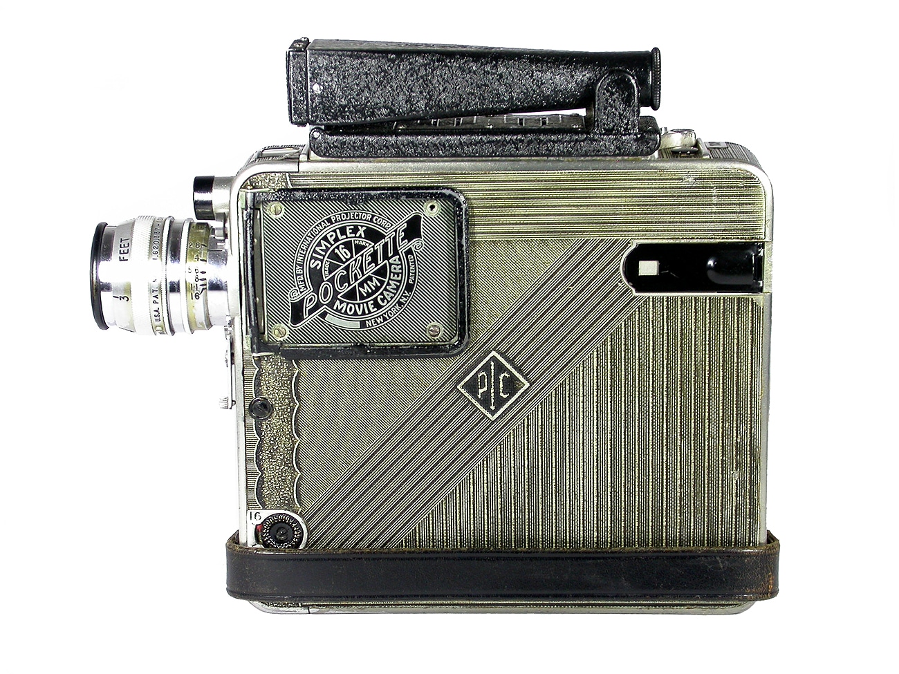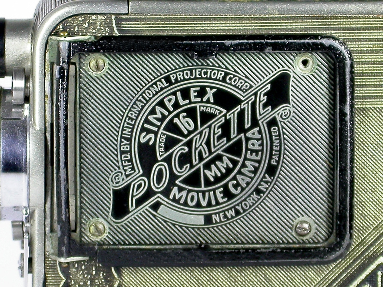 Filmkamera IPC Simplex Pockette (1932), hergestellt von der „International Projector Corp. of New York, N.Y.“. Diese Kamera benutzte 16-mm-Film in vorgeladenen Filmpatronen, weshalb man den Film nicht extra mühsam einfädeln musste. Filmtransport per Federwerk (im Bild oben ist – links unten – der Aufzugsschlüssel eingeklappt). Auslöser für Einzelbildschaltung und Dauerlauf. Objektiv (wechselbar) hier ein Kodak Anastigmat 1:1,9/25 mm. Interessant ist die Oberflächengestaltung des Gehäuses: Was auf den ersten Blick wie ein direkt in das Metall eingraviertes Muster aussieht, erweist sich bei näherem Hinsehen als geprägte Belederung.