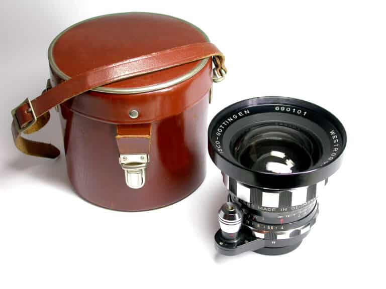 Eindrucksvolles, massives Weitwinkelobjektiv für Kleinbildkameras mit dem Exakta-Bajonett (Exakta, Exa, Topcon) von Isco Göttingen, gebaut Ende der 1950er Jahre. 8 Elemente in 6 Gruppen in einem hochwertigen Messinggehäuse im zeitgenössischen Schwarz-Silber-Design (Zebra-Design). Das Filtergewinde misst 82 mm, die kürzeste Einstellungsentfernung ist 50 Zentimeter, der Bildwinkel beträgt 82 Grad.