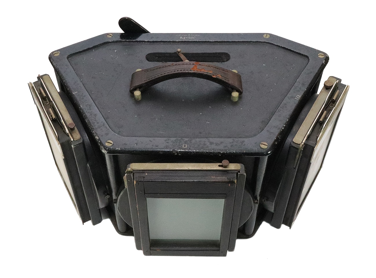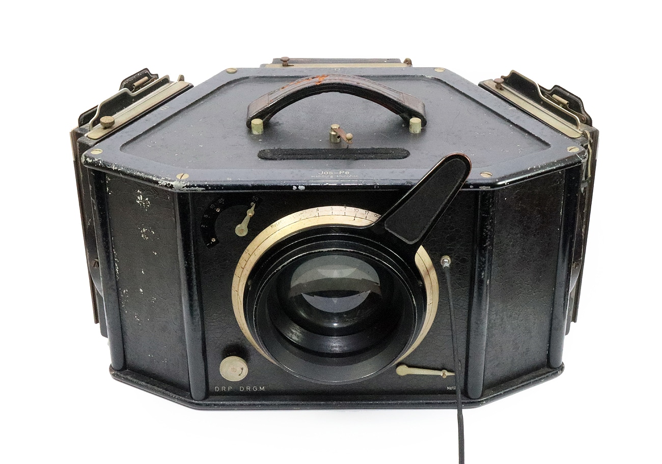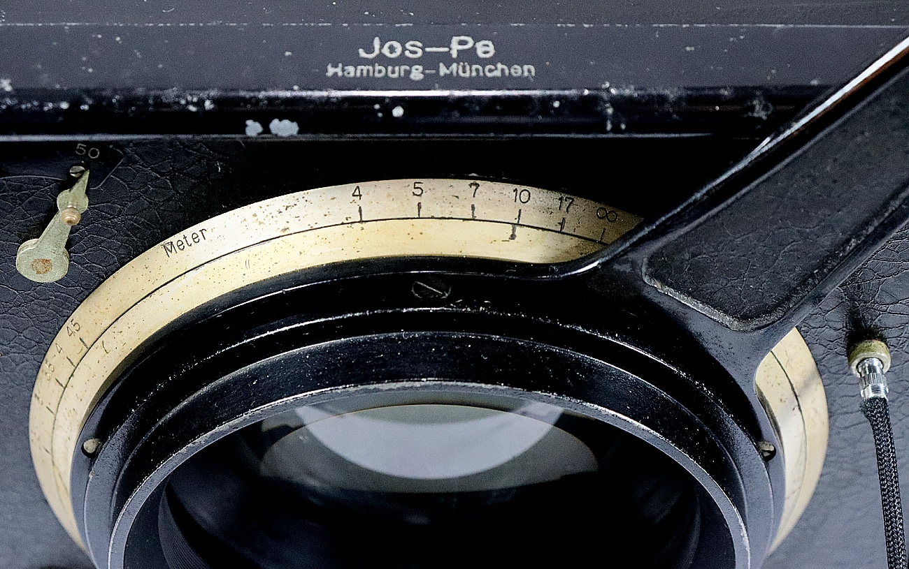 Die hier präsentierte Jos-Pe Dreifarbenkamera, frühes Modell, dürfte nach allem, was im Internet über diese absolute Rarität in Erfahrung gebracht werden kann, eine sehr seltene und damit auch wertvolle Variation dieses Typs sein. Von dieser Tri-Color-Kamera für die Plattenformate 4,5 x 6 cm und 9 x 12 cm sollen laut Fachbuchautor James Cornwall von 1924 bis 1934 oder 1936 insgesamt nicht mehr als 1.500 Apparate hergestellt worden sein. Das Museumsexemplar mit den stolzen Abmessungen 39 x 19 x 25 cm (Breite x Höhe x Tiefe) trägt übrigens die frühe Seriennummer 126. Das Gehäuse besteht aus Gusseisen und ist über 9 Kilogramm schwer. Entsprechend groß und stabil ist das Stativgewinde ausgeführt und im Boden verankert.