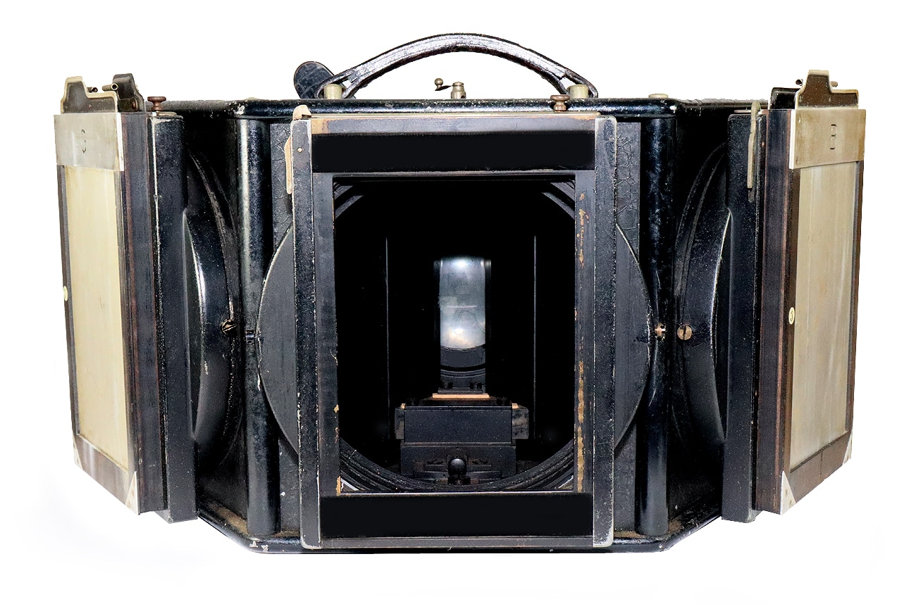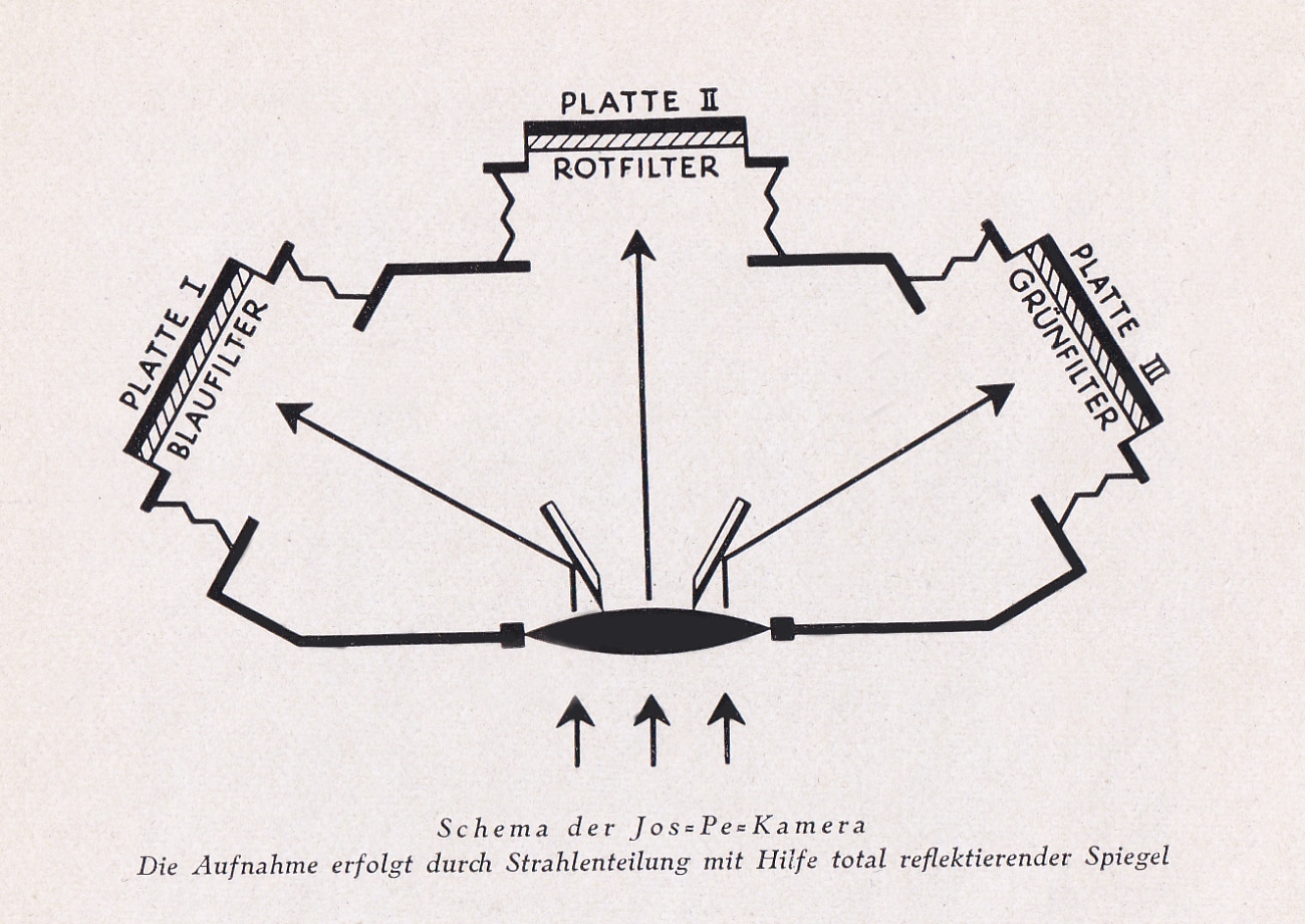 Mit solchen Spezialkameras wurden gleichzeitig die drei für Farbbilder benötigten Aufnahmen gemacht. Dazu befand sich hinter dem Objektiv ein optisches Strahlenteilerelement, welches das Bild auf die drei mit Filtern verbundenen schwarz-weißen Fotoplatten ablenkte.