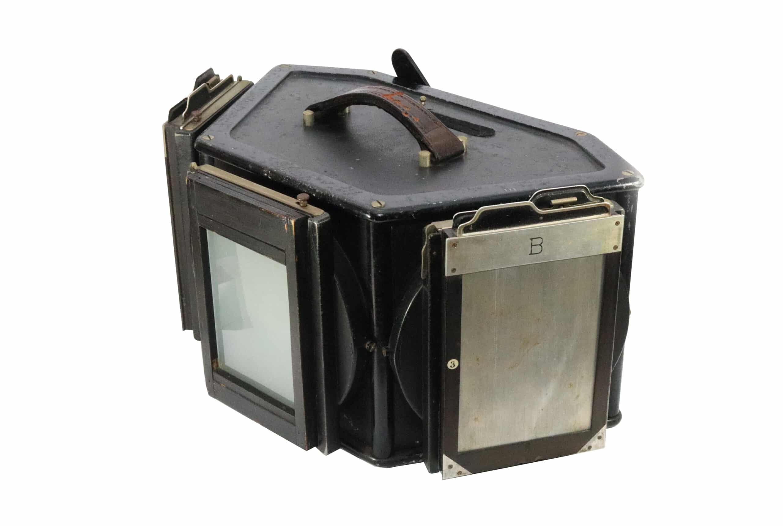 Es gibt drei entsprechende Positionen für die Befestigung der Rückteile: hinten und schräg an jeder der beiden Seiten. Diese Anschlüsse sind hier mit „I“, „II“ und „III“ römisch durchnummeriert, die Plattenrückteile entsprechend mit R, G und B (Rot, Grün und Blau) gekennzeichnet. Vor den drei Platten wurde ein entsprechender Farbfilter (in der gleichen Größe wie die Platte) platziert. Alle drei Platten wurden gleichzeitig beispielsweise durch ein Prisma oder – wie hier – einen Strahlenteiler direkt hinter dem Aufnahmeobjektiv belichtet, so dass bei bewegten Szenen (Personen oder Fahrzeuge) keine Differenzen in den Positionen auftreten konnten. Ein weiterer Vorteil: Zum Scharfstellen musste nur eine Kassette gegen eine Mattscheibe ausgetauscht werden. Diese raffinierte Konstruktion war übrigens patentrechtlich geschützt.