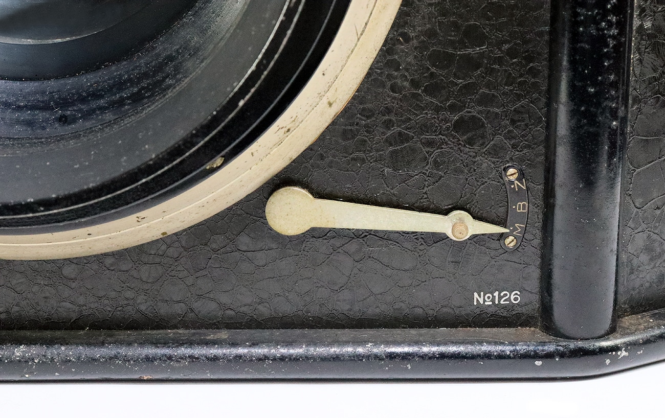 Der Verschluss (Moment = „M“) reicht von 1 bis 1/50 Sekunde und ist für manuelle Langzeitbelichtungen auf „B“ oder „Z“ (entspricht T bei anderen Verschlüssen) einstellbar (im Bild der Hebel rechts unten). Aufgezogen wird der Verschluss mit dem Rändelrad links unten an der Frontplatte. Beim Museumsexemplar laufen die Zeiten noch hörbar geschmeidig ab. Eingestellt werden die „M“-Zeiten mit dem Hebel links oben. Ausgelöst wird mit einem Drahtauslöser (rechts vom Objektiv).