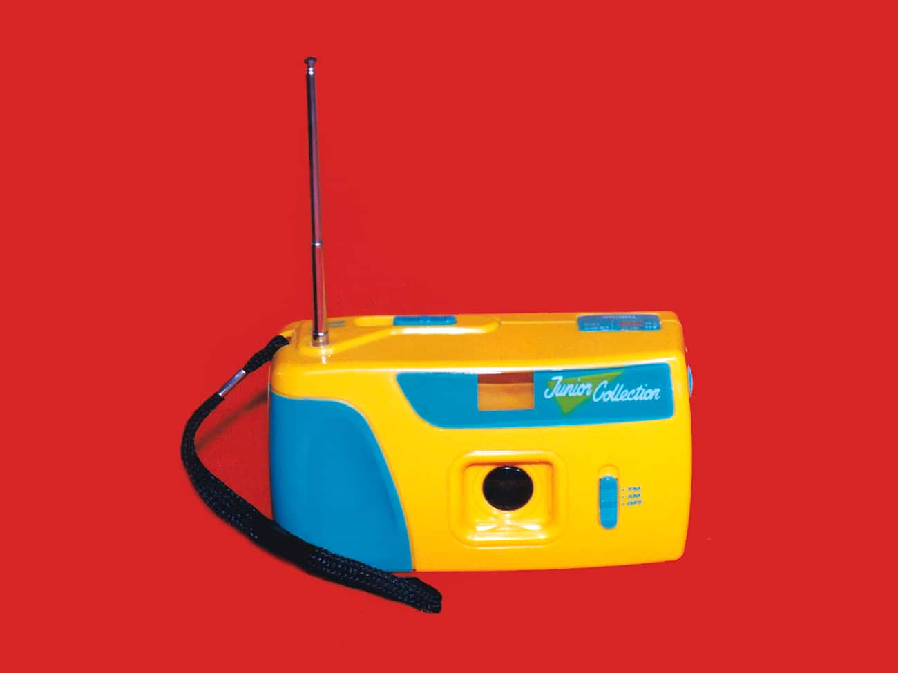 Sieht aus wie eine einfache Kleinbildkamera, ist aber ein Radiogerät für UKW und Mittelwelle in Form und Größe eines Fotoapparats. Die Antenne ist ausziehbar, das Museumsexemplar will aber nicht so recht. Als Kamera ist dieses Kinderspielzeug aus den 1990er Jahren nicht funktionsfähig. Mit dabei ein Trageriemen.