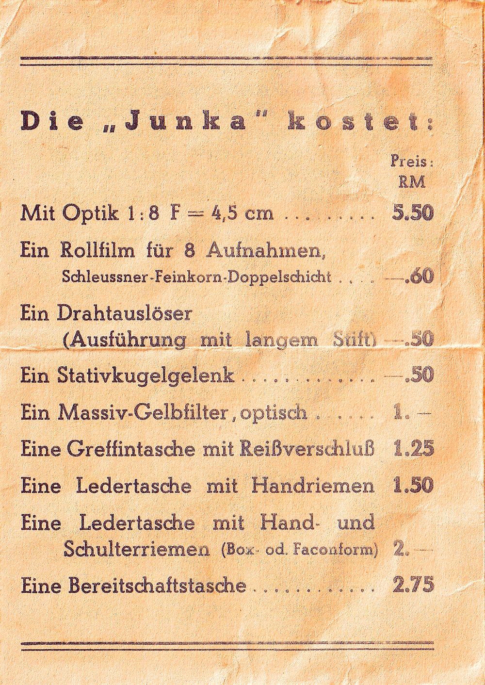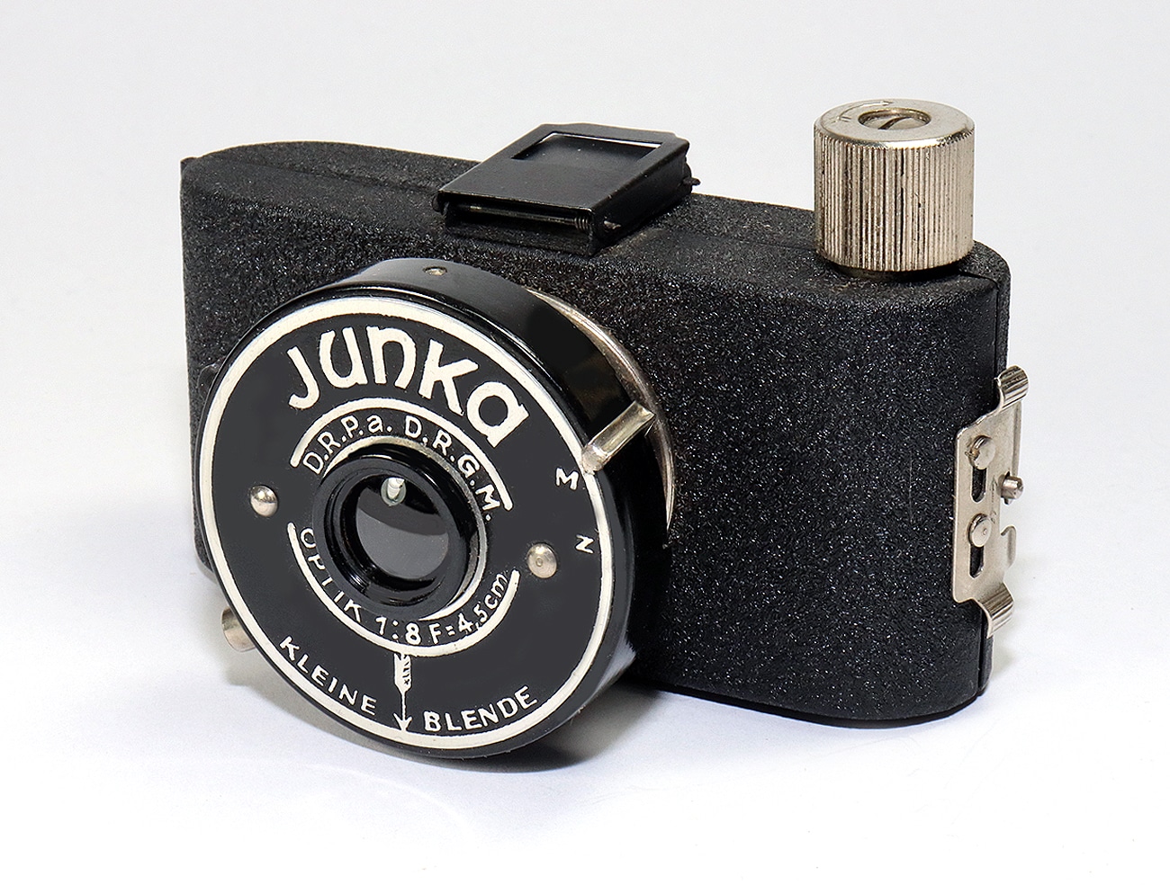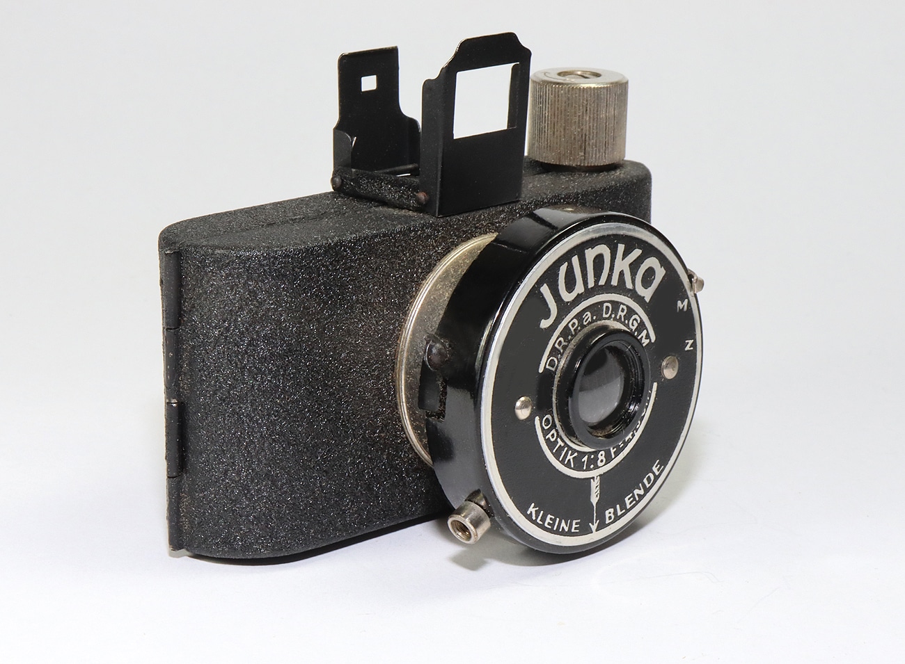 Begehrte Sucherkamera aus den 1930er Jahren für das Aufnahmeformat 3 x 4 cm auf einemspeziell von Adox entwickelten Rollfilm. Hersteller: Junka-Kamera-Werk, G. Zimmermann, Zirndorf bei Nürnberg. Manuelle Scharfeinstellung, mechanischer Zentralverschluss, manuelle Belichtungssteuerung. Objektiv: 1:8/45 mm. Katalogauszug: „Die Kleinbildkamera Junka der Junkawerke bedeutet eine gelungene Neukonstruktion im Kamerabau. Der kleine, zierliche, ganz aus Metall gearbeitete Apparat ist eingerichtet für 8 Aufnahmen im Format 3 x 4 cm. Einstellung der Entfernung nicht erforderlich. Nähe und Ferne werden in gleicher Schärfe wiedergegeben. Die Verschlussauslösung erfolgt von Hand oder mittels Spezialdrahtauslöser. Laden erfolgt mit Schleussner Tempo-Gold Feinkorn-Film oder Olympan-Feinkorn-Film für 8 Junkaaufnahmen. Ausstattung: Ganzmetallgehäuse, optischer Fernrohrsucher – alle Aufnahmen werden in Augenhöhe gemacht -, Optik 1:8, Brennweite 4,5 cm, 2 Blenden. Verschluss: Zeit und Moment, großer, bequemer Filmtransportknopf, Filmandruckplatte. Preis des Apparats: 5,50 Reichsmark“. Im Museum mit Originalschachtel und einer sechsseitigen Gebrauchsanweisung mit Preisen in Reichsmark („R. M.“)