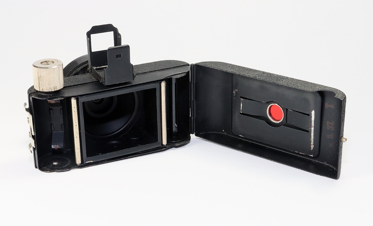 Nun gibt es zu dieser Kamera im WWW jede Menge Infos, die sich teilweise deutlich widersprechen: So heißt es oft, nur im ersten Baujahr (1935) habe die Junka einen klappbaren Rahmensucher gehabt, später immer einen Durchsichtssucher. Anfangs habe der Patenthinweis unterhalb des Schriftzugs Junka „D. R. G. M“ gelautet. Im Deutschen Kameramuseum befindet sich aber dieses hier gezeigte Exemplar, auf dessen Rückwand innen das Herstellungsdatum „9.8.37 T“ eingestempelt ist. Diese Kamera hat zwar einen Klappsucher, aber die Beschriftung auf der Frontplatte ist „D. R. P. a. D. R. G. M.“, was so viel bedeutet wie „Deutsches Reichspatent angemeldet“ und „Deutsches Reichs-Gebrauchsmuster“. Letztere Bezeichnung wurde bis 1949 verwendet bis zur Gründung der beiden deutschen Staaten. Die Originalschachtel wiederum ist mit „1004“ beschriftet, was eine Seriennummer bedeuten könnte oder eine Nummer des Fotohändlers oder eines späteren Sammlers. Auf einem Rechnungsformular des Herstellers vom Dezember 1936 zu einer anderen Kamera ist diese doppelte Patentbezeichnung auf einer Zeichnung ebenfalls angebracht. Was stimmt also?