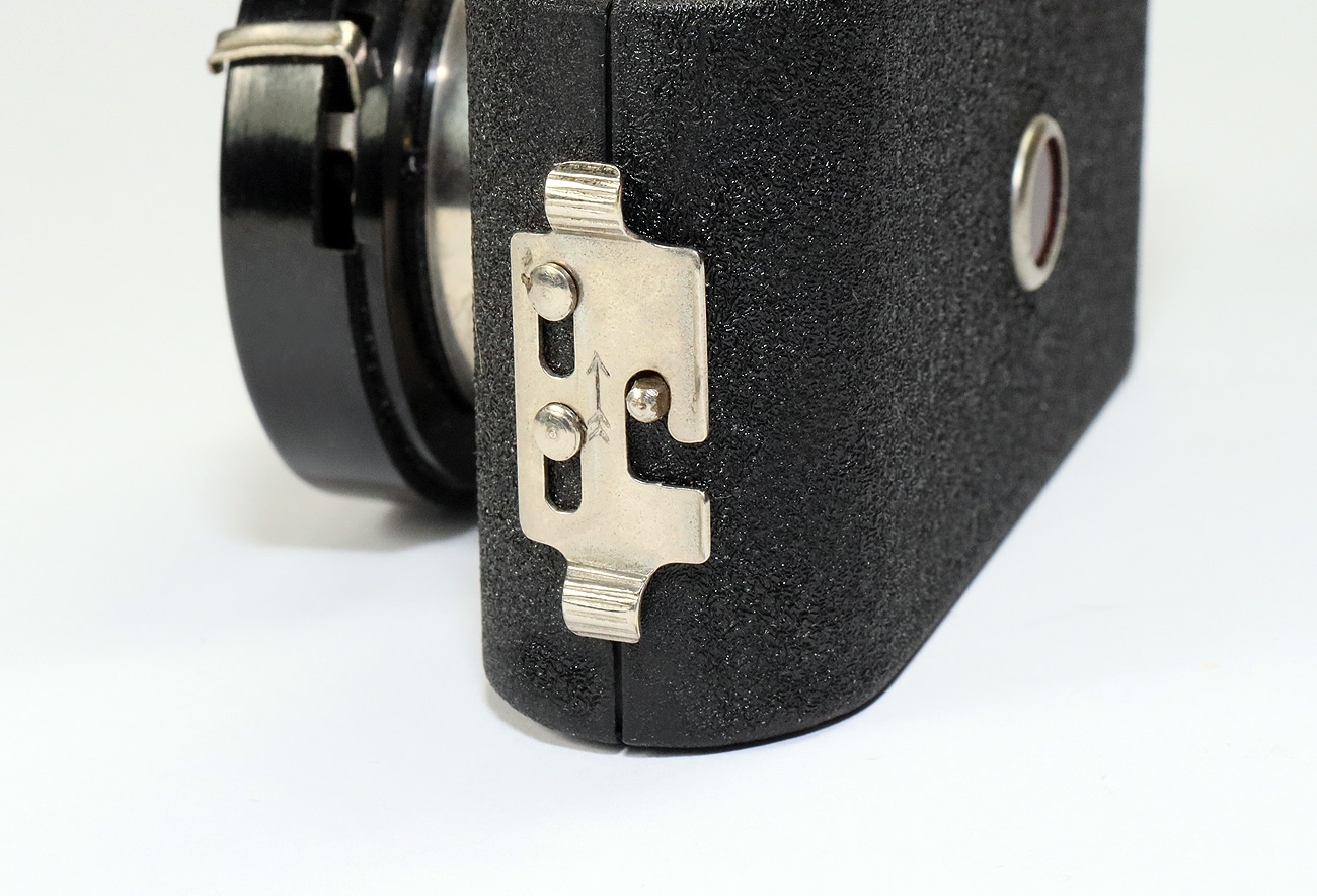Der Sockel des Klappsuchers ist bei diesem Exemplar höher ausgeführt als beim zweiten Museums-Modell, das nur die Beschriftung „D. R. G. M.“ trägt. Sonst sind die Kameras baugleich.
