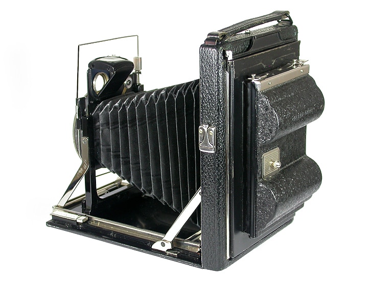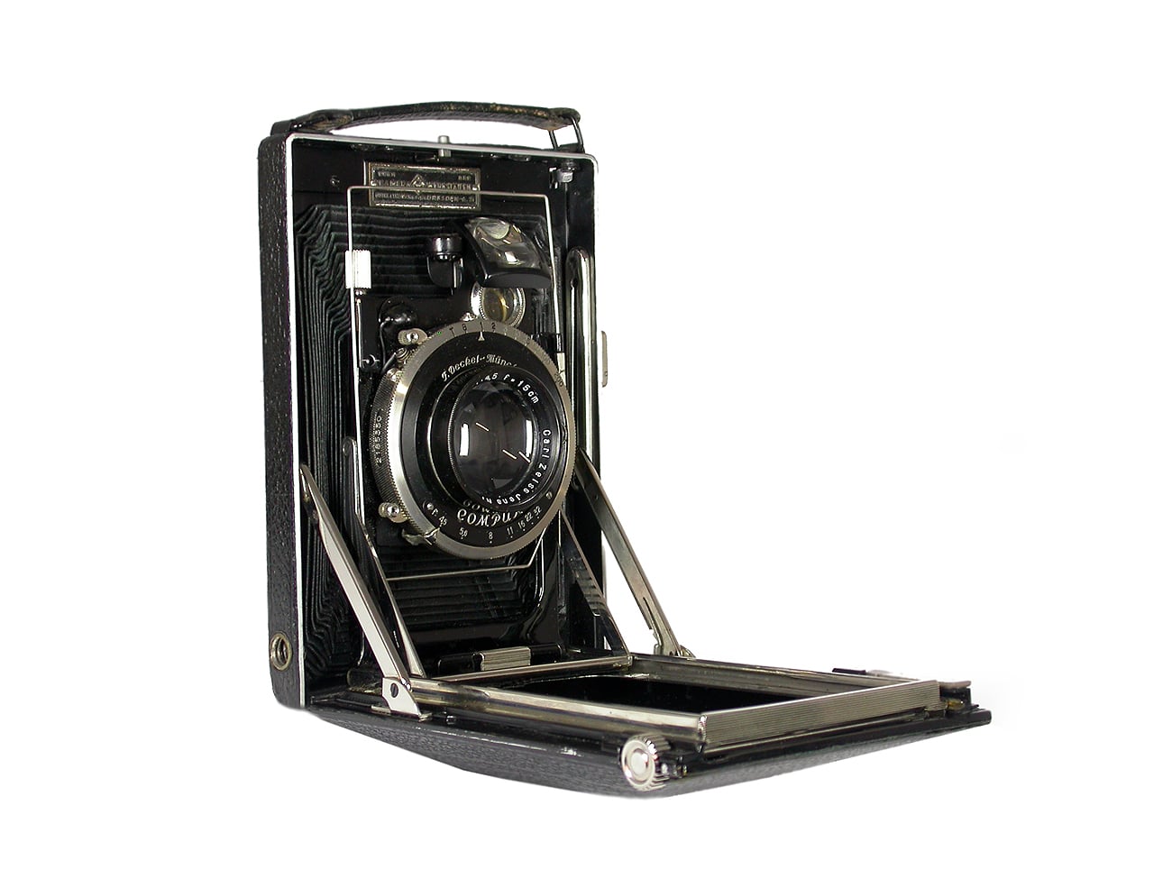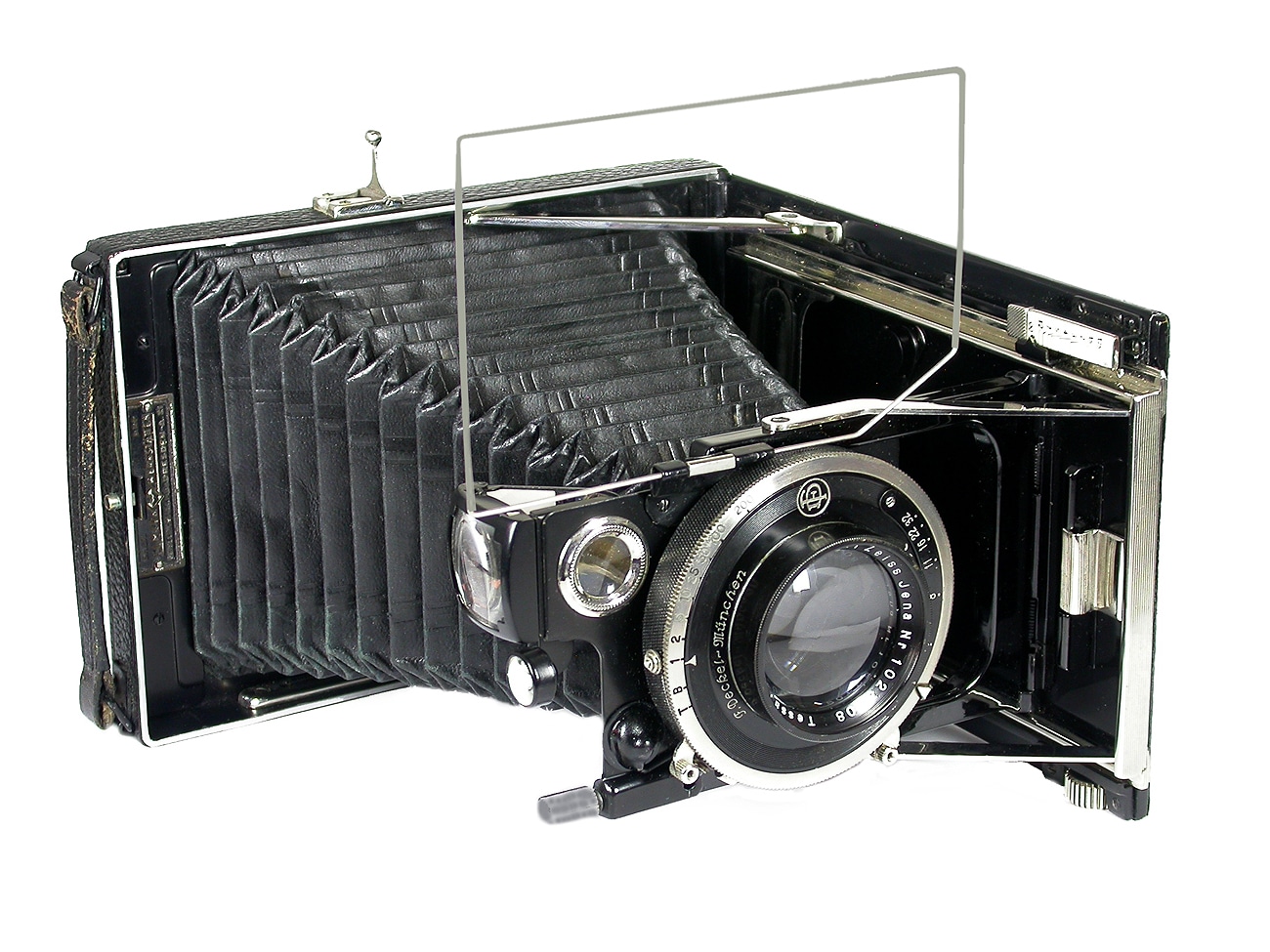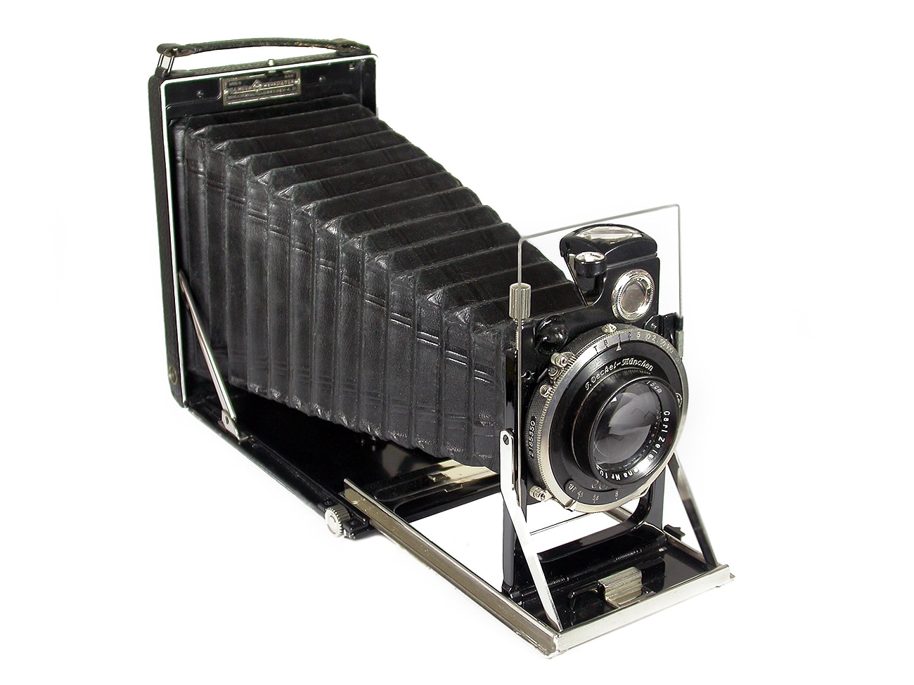Die berühmte Patent Etui 9 x 12 cm, Baujahr etwa 1930, Hersteller: K.W. Kamerawerkstätten Guthe & Thorsch, Dresden. Sie hat ein verhältnismäßig lichtstarkes Objektiv von Carl Zeiss Jena (Tessar 1:4,5/15 cm) in einem Compur-Verschluss (T, B, 1 bis 1/200 Sekunde) und (Bild) einen doppelten Auszug. Die Frontstandarte lässt sich nach oben und unten verschieben. Eine Libelle ist neben dem Winkelsucher eingebaut.