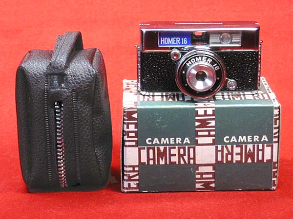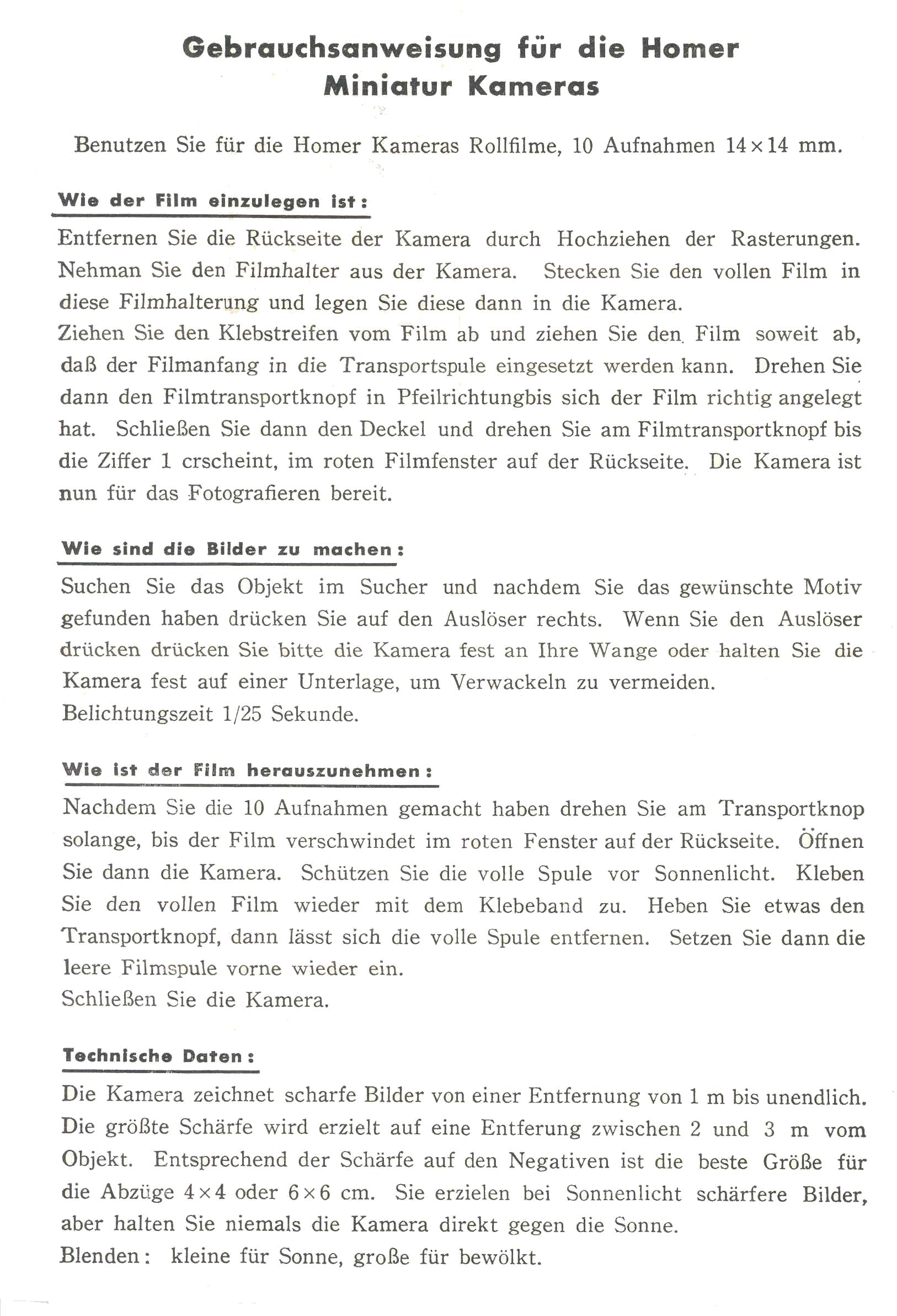 Sucherkamera für einen speziellen 17,5-mm-Rollfilm (zehn Aufnahmen im Format 14 x 14 Millimeter), hergestellt von Kambayashi & Co., Japan, etwa 1960. Das entzückende Gerät (außen Chrom, innen Plastik) in der Größe einer ganz normalen Streichholzschachtel ist voll funktionsfähig. Fixfokus-Objektiv (Mindestabstand 1 Meter), Durchsichtsucher, Einfachverschluss (nach Herstellerangaben 1/25 Sekunde), zwei Blenden (8 und 11). Die maximale Schärfe sollte bei Aufnahmen aus zwei bis drei Metern Entfernung und bei Sonnenlicht erreicht werden; als Bildformat für das Positiv wurden 4 x 4 cm oder 6 x 6 cm empfohlen. Im Bild links des Suchers das Typenschild, rechts ein vorgetäuschtes Messfenster.
