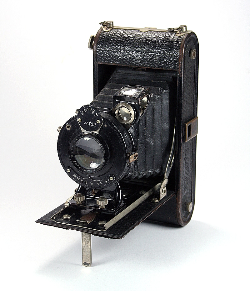 Seltene Klapp-/Laufbodenkamera für den Rollfilm 120 (Aufnahmeformat 6 x 9 cm), hergestellt um 1930 von Wilhelm Kenngott, Stuttgart. Objektiv: Wekar-Anastigmat 1:4,5/10,5 cm; Seriennummer: 4002, manuelle Fokussierung über den Laufboden mittels Radialhebel. Schwenkbarer Brillantsucher; Mechanischer Zentralverschluss Vario (B, T, 1/25 bis 1/100 Sekunde). Der Auslöser am Verschluss fehlt; ebenso der Tragegriff am Gehäuse.