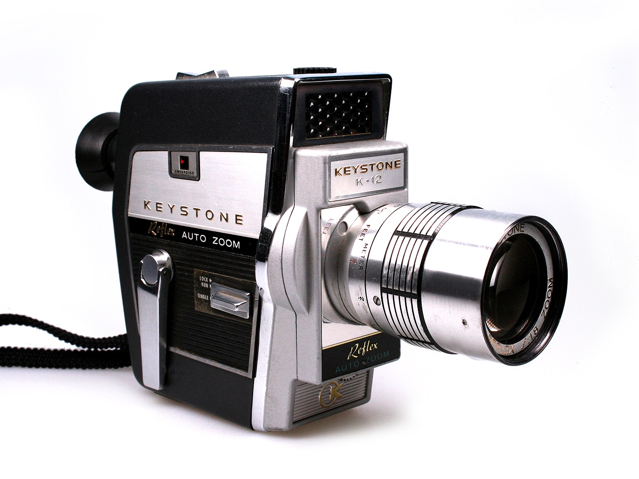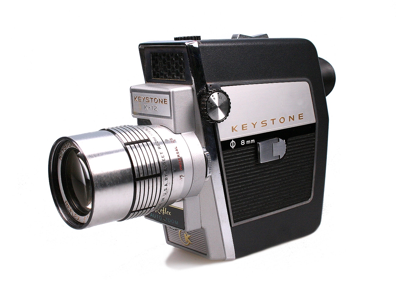 Schmalfilmkamera für Doppel-8-Spulen, hergestellt in den USA in den 1950er Jahren. Objektiv: Keystone Focusing Zoom Lens 1:1,8/9-27 mm (Made by Elgeet, Rochester); manuelle Fokussierung; Brennweitenverstellung motorisch oder manuell. Reflexsucher mit Blendenanzeige. Federwerksantrieb (Einzelbild; 16 Bilder pro Sekunde). Belichtungsmesser mit Selenzelle (Electric Eye), manuelle oder automatische Belichtungssteuerung. Auch die motorische Brennweitenverstellung geschieht durch das Federwerk, ist allerdings nur während der Filmaufnahme möglich. Stativanschluss; Pistolengriff als Zubehör.