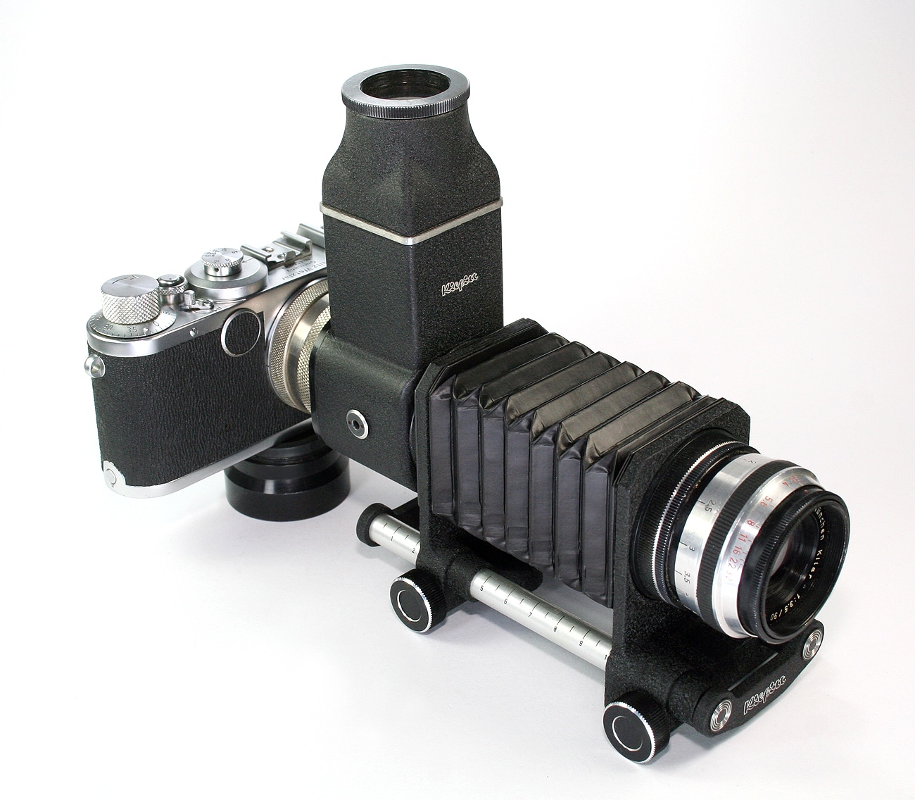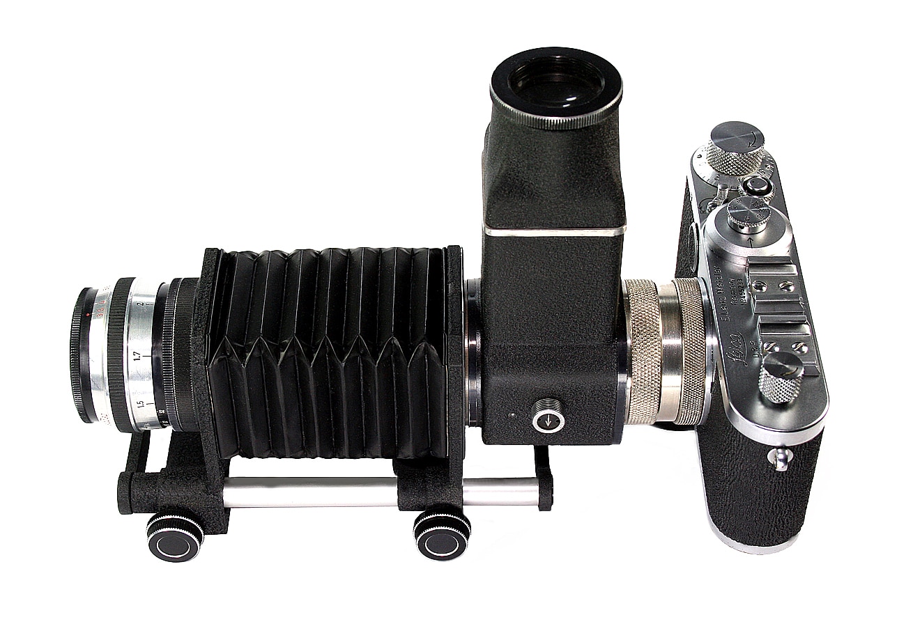 Ein Spiegelkasten für die Schraub-Leica mit kameraseits M-39-Anschluss. Der Leitz-eigene Spiegelkasten Visoflex hatte auch andere Firmen wie Kilfitt (Bild) auf den Plan gerufen, die ebenfalls solche Spiegelkästen bauten, die den bauartbedingten Nachteil der Messsucherkamera Leica im Nahbereich ausgleichen sollten. Hier eine Leica Ic mit Spiegelkasten Kilarflex von Kilfitt (München), Balgengerät Kilfitt (Made in Liechtenstein) sowie dem passenden Objektiv Heinz Kilfitt München Kilar 1:3,5/90 mm C.