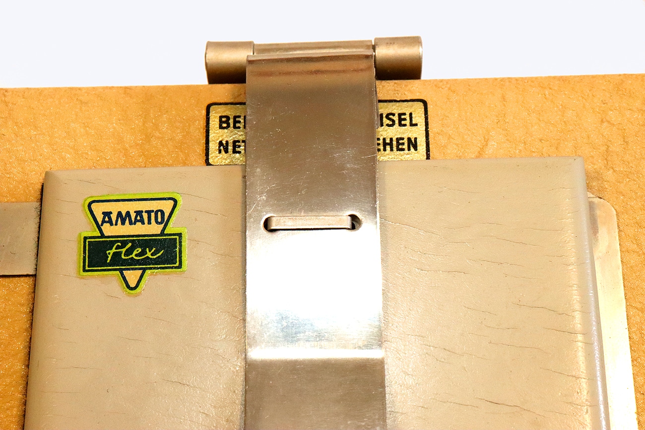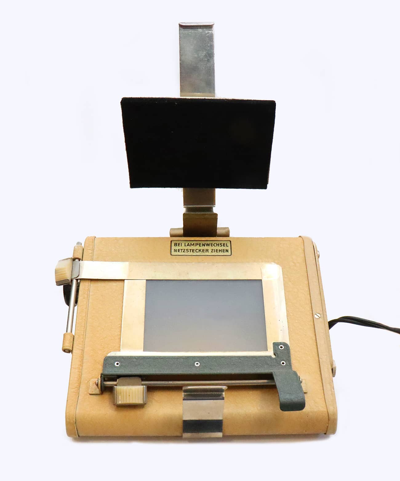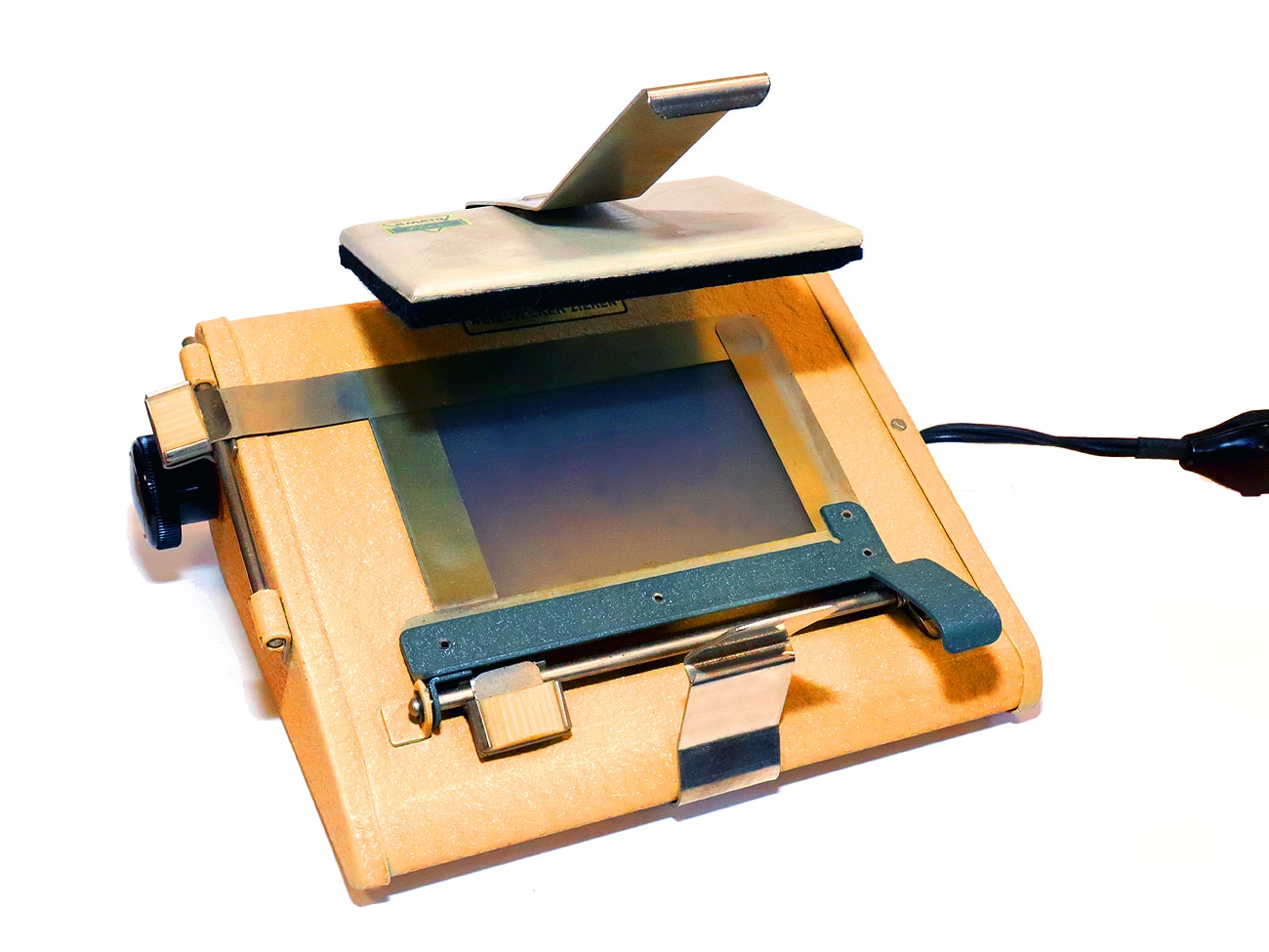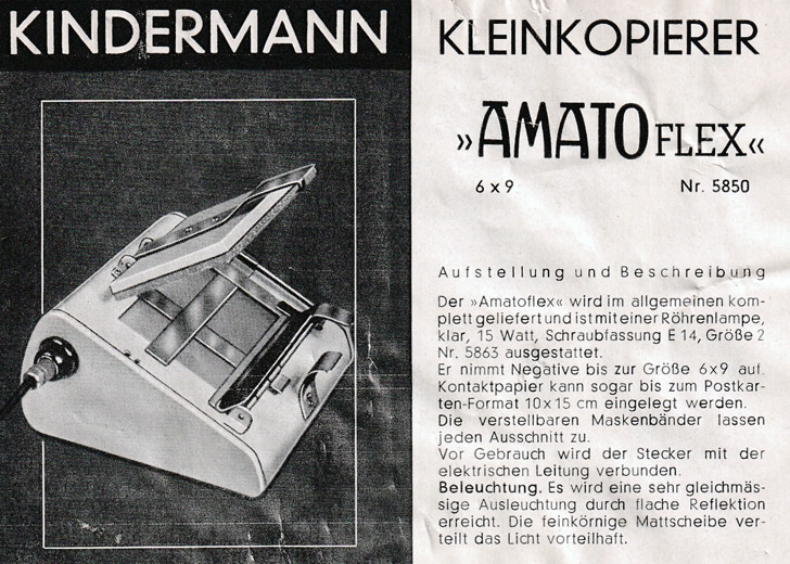 Kopiergerät zum Herstellen von Kontaktkopien bis zum Negativformat 6 x 9 cm, von Kindermann, Ochsenfurt am Main, 1950er Jahre. Im inneren hinteren Bereich des Gehäuses ist eine 15-Watt-Lampe für die Belichtung angeordnet. Für die vorbereitenden Arbeiten lässt sich mit dem Drehknopf an der linken Seite ein Orangefilter vor die Lampe schwenken. Auf der Mattscheibe wird der zu kopierende Film unter den verschiebbaren Maskenbändern eingelegt, das Fotopapier an der grauen Anschlagleiste aufgelegt (beide mit Schichtseite nach unten), der Deckel geschlossen und dann bei zurück geschwenktem Filter die Belichtung durchgeführt.