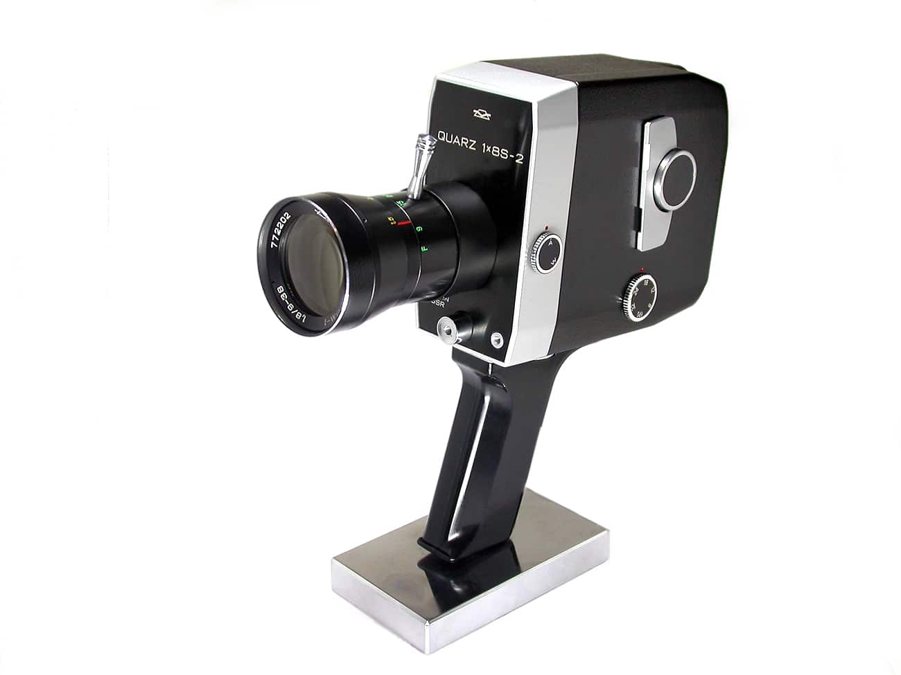Das besondere: Der Filmtransport erfolgt noch nicht elektrisch, sondern per Federwerk: eine der ganz wenigen Super-8-Filmkameras mit rein mechanischem Antrieb.