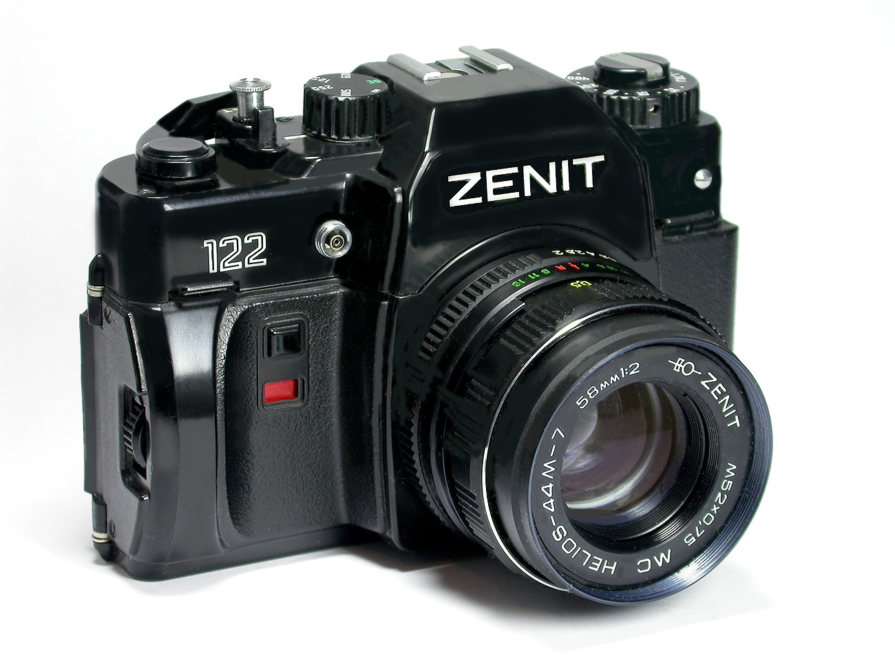Einäugige Spiegelreflexkamera (SLR), hergestellt von 1989 bis 2005, für den Kleinbildfilm 135 (Aufnahmeformat: 24 x 36 mm). Für Wechselobjektive mit M-42-Gewinde (1.972.000 Exemplare), hier mit Helios-44 M-7 1:2,0/58 mm; die Zenit 122 war auch mit K-Bajonett als 122 K erhältlich; manuelle Fokussierung. Prismensucher. Mechanischer Schlitzverschluss (schnellste Verschlusszeit: 1/500 Sekunde); mittenbetonte TLL-Belichtungsmessung, manuelle Belichtungssteuerung. Ungewöhnlich: der mechanische Selbstauslöser. Mit dem Rändelrad (im Bild auf der linken Seite) wird eine Feder mehr oder minder stark aufgezogen, das rote Fenster unterhalb des Selbstauslöserknopfes verändert sich dann nach grün. Nach dem Druck auf den schwarzen Knopf dauert es eben mehr oder minder lange, bis die Kamera auslöst. Innen Metalldruckguss, außen Kunststoffgehäuse.