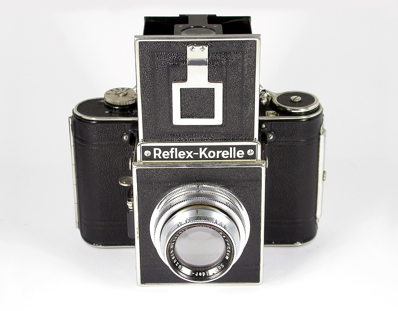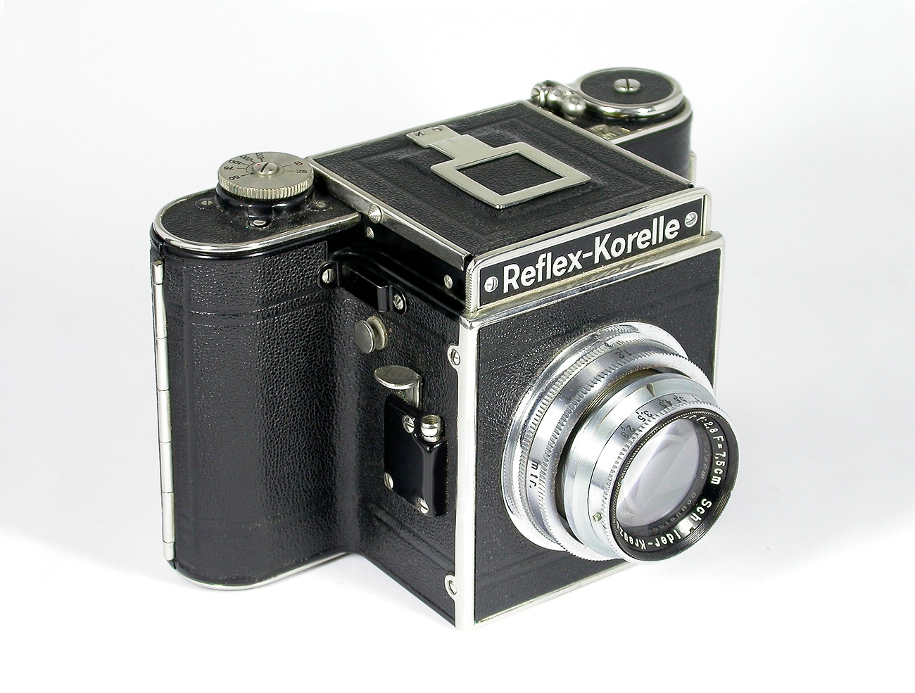 Die Spiegelreflex Reflex-Korelle 6 x 6 aus Dresden (Baujahr: 1935) wurde in zwei Ausführungen geliefert. Korelle I: Mit Geschwindigkeiten 1/25, 1/50, 1/75, 1/100, 1/200 und 1/500 Sekunde (hier im Bild). Und als Korelle II mit weiteren Geschwindigkeiten 2, 1, 1/2, 1/5, und 1/10 Sekunden und eingebautem Selbstauslöser. Die Reflex-Korelle 6 x 6 cm für Rollfilm 120 wurde mit Markenobjektiven der Lichtstärke 1:4,5 bis 1:2,8 mit Brennweiten bis 360 mm ausgerüstet (hier mit dem Schneider-Kreuznach 1:2,8/75 mm). Die Optik ist durch Schraubgewinde auswechselbar. Filmtransport und Verschlussaufzug sind miteinander gekuppelt. Eine Zähluhr zeigt die Zahl der gemachten Aufnahmen an. Die Kamera hat einen versenkbaren Rahmensucher für Aufnahmen in Augenhöhe.