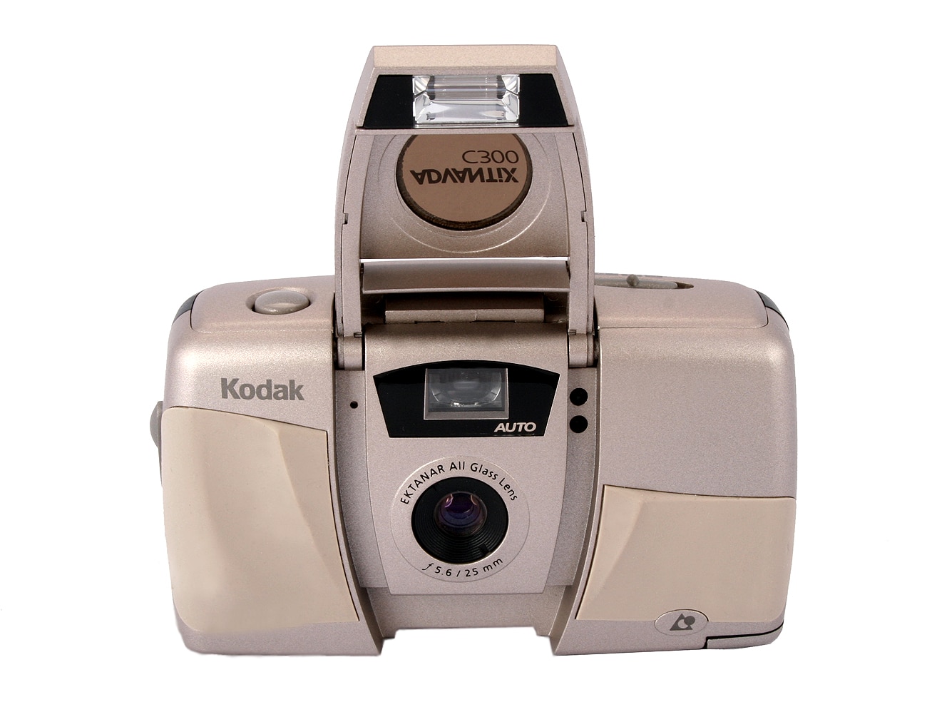 Sucherkamera aus dem Jahr 2000 für den APS-Film (Aufnahmeformat: 16,7 x 30,2 mm). Objektiv: Ektanar All Glass Lens 1:5,6/25 mm, Fixfokus. Einfachverschluss, eingebauter Winder, automatischer Filmtransport. Der eingebaute Blitz reduziert den Rote-Augen-Effekt, automatische Blitzzuschaltung, LCD-Display.