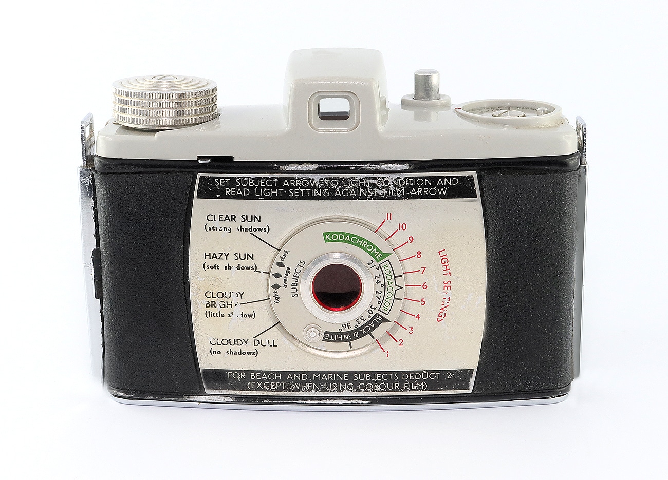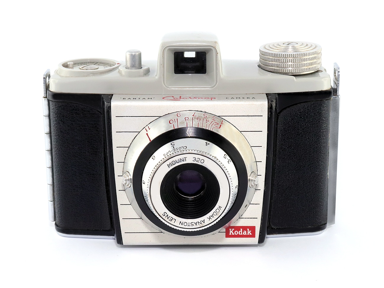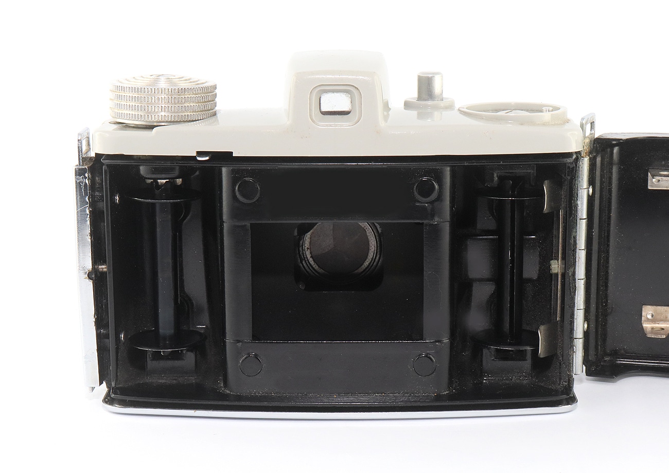 Sucherkamera (1955) für den seltenen Rollfilm 828 (Aufnahmeformat: 28 x 40 mm), Made in England by Kodak Limited London. Objektiv: Kodak Anaston Lens Mount 320, manuelle Fokussierung, PC-Blitzbuchse. Metallgehäuse mit Plastiküberzug, Durchsichtsucher. Einfachverschluss (Moment); Hilfe zur richtigen Belichtungseinstellung mit Hilfe eines mechanischen Rechners auf der Rückwand; Filmmerkscheibe auf der Oberkappe. Stativanschluss (1/4″).