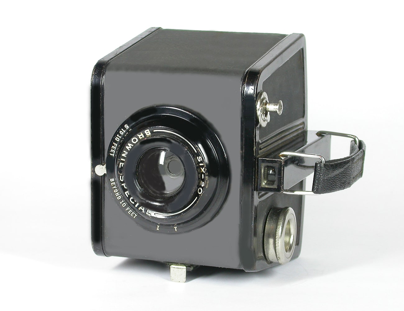 Eine Boxkamera mit dem Aufnahmeformat 6 x 9 cm (Rollfilm 620), 1938 bis 1942 gebaut in den USA. Fixfokus-Objektiv mit einer einklappbaren Vorsatzlinse für zwei Entfernungsbereiche (5 to 10 feet – Beyond 10 feet). Newton-/Fernrohrsucher. Verschluss mit zwei Einstellungen: Moment und T. Bei dem hier abgebildeten Museumsexemplar (mit ausgeklapptem Fuß für Aufnahmen im Hochformat) fehlt die komplette Belederung.