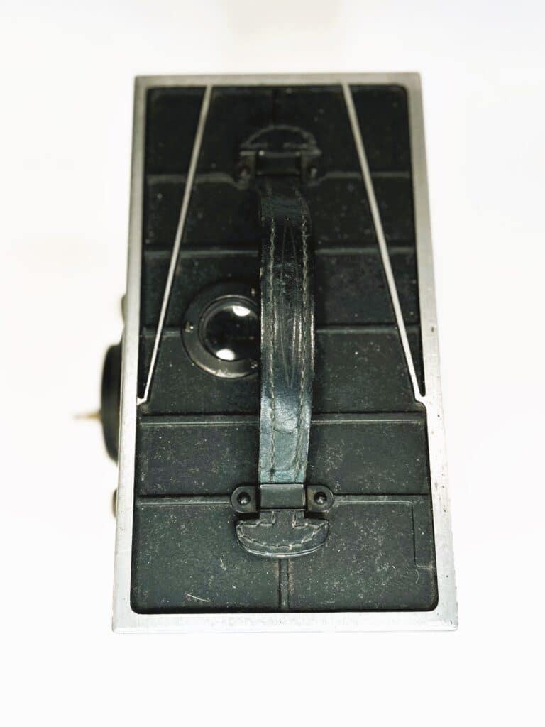 Bei diesem Museumsmodel findet sich anstatt der Handkurbel der Ankoppelungsmechanismus für einen Elektromotor und es fehlt das Wechselobjektiv.
