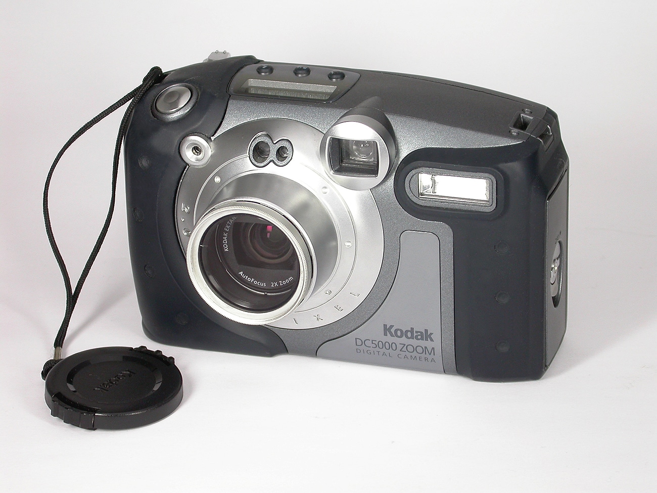 Interessante Kodak-Digitalkamera (2000) im spritzwassergeschützten Gehäuse. Zoom-Sucherkamera, CCD-Sensor mit 2,3 Megapixeln, Verschlusszeit: 1/2-1/750 Sekunde. Objektiv: 1:3,0-3,8/6,5-13 (30-60 mm Brennweite bezogen auf Kleinbildformat) und digitales Dreifach-Zoom. Auflösung: 1.760 x 1.168 Pixel, Dateiformat: jpg. Wechselspeicher: CompactFlash Typ I, 1,8 Zoll LCD-Monitor. Anschluss für Netzgerät, PAL/NTSC-Videoausgang. Autofokus, Schärfebereich: 50 cm bis unendlich, Nahaufnahmen/Makro: 25 cm bis 50 cm. TFT-LCD-Monitor und optischer Sucher. Eingebautes Blitzgerät (Blitzreichweite: 0,50 m bis 3 m). Selbstauslöser, manueller Weißabgleich, Bild-Effekte (Sepia-Tönung, Schmuckrahmen, spezielle Effekte); S/W-Modus; Anzeige von Datum und Uhrzeit; Stativgewinde; Textmodus zur kontrastreichen Aufnahme von Textdokumenten. Die Kodak DC 5000 Zoom wiegt betriebsbereit 520 Gramm. Stromversorgung: 4 x Alkali-Batterie Typ AA, 4 x NiMH-Akku Typ AA, Netzgerät.
