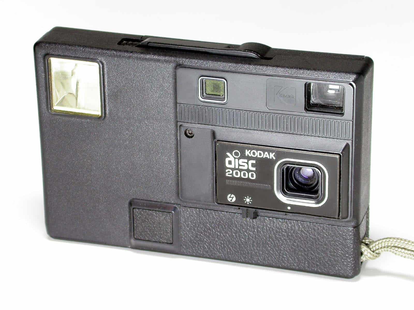 Disc-Kamera (1982-1984) von Kodak, dem Erfinder der längst wieder vom Markt verschwundenen „Filmscheibe“ (Bildformat 8 x 10,5 mm). Objektiv: Fixfokus 1:2,8/12,5 mm. Eingebauter E-Blitz, eingebauter Winder. Schnellste verschlusszeit: 1/200 Sekunde.