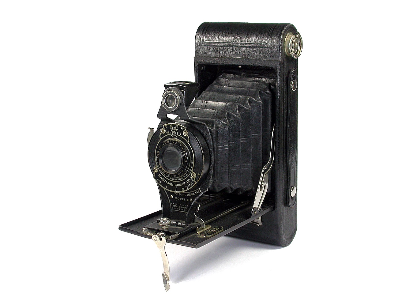 Klapp-/Laufbodenkamera für den Rollfilm 120 (Aufnahmeformat 6 x 9 cm), 1930er Jahre. Objektiv: H. Roussel Paris Taylor 1:6,3, mechanische Scharfeinstellung. Brillantsucher. Mechanischer Zentralverschluss Kodek No. 1 (T, B, 1/25 bis 1/50 Sekunde), manuelle Belichtungssteuerung.