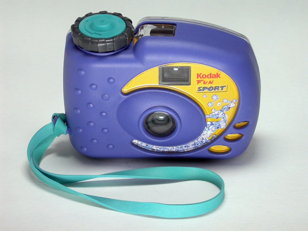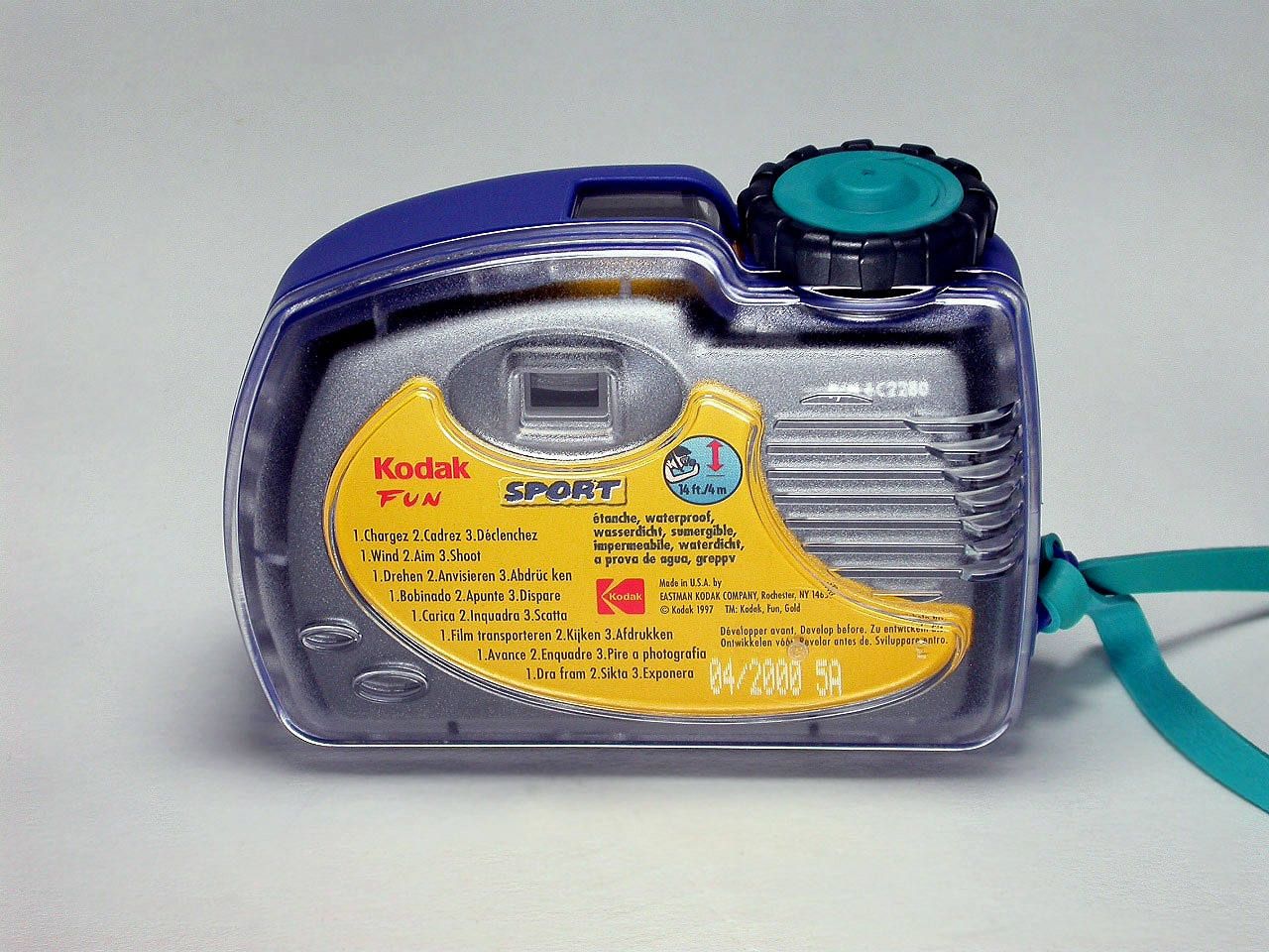 Einwegkamera von Kodak, USA, 1997, für den Kleinbildfilm 135 (Negativformat: 24 x 36 mm). Wasserdicht bis vier Meter Tauchtiefe. Objektiv: Meniskuslinse, Fixfokus. Durchsichtsucher. Geladen für 27 Aufnahmen.