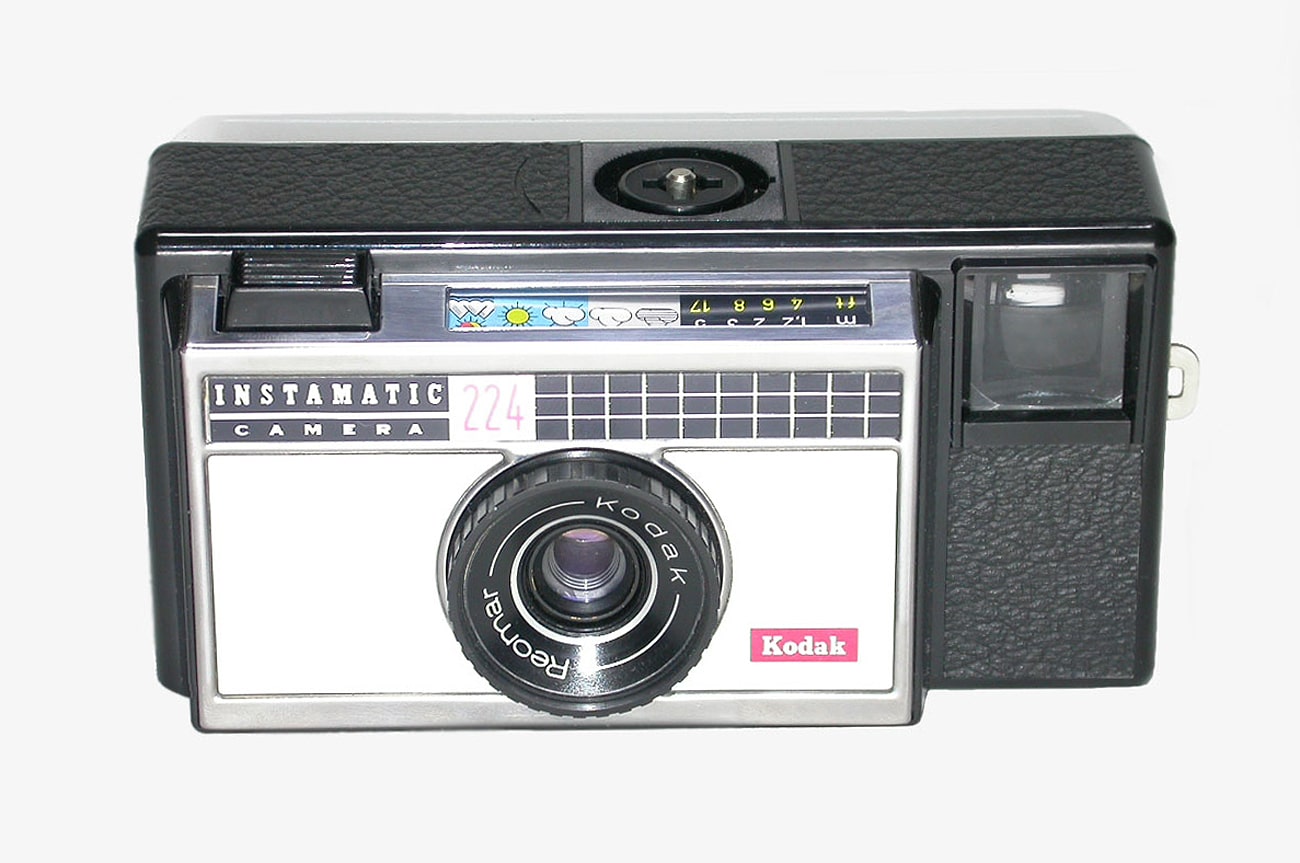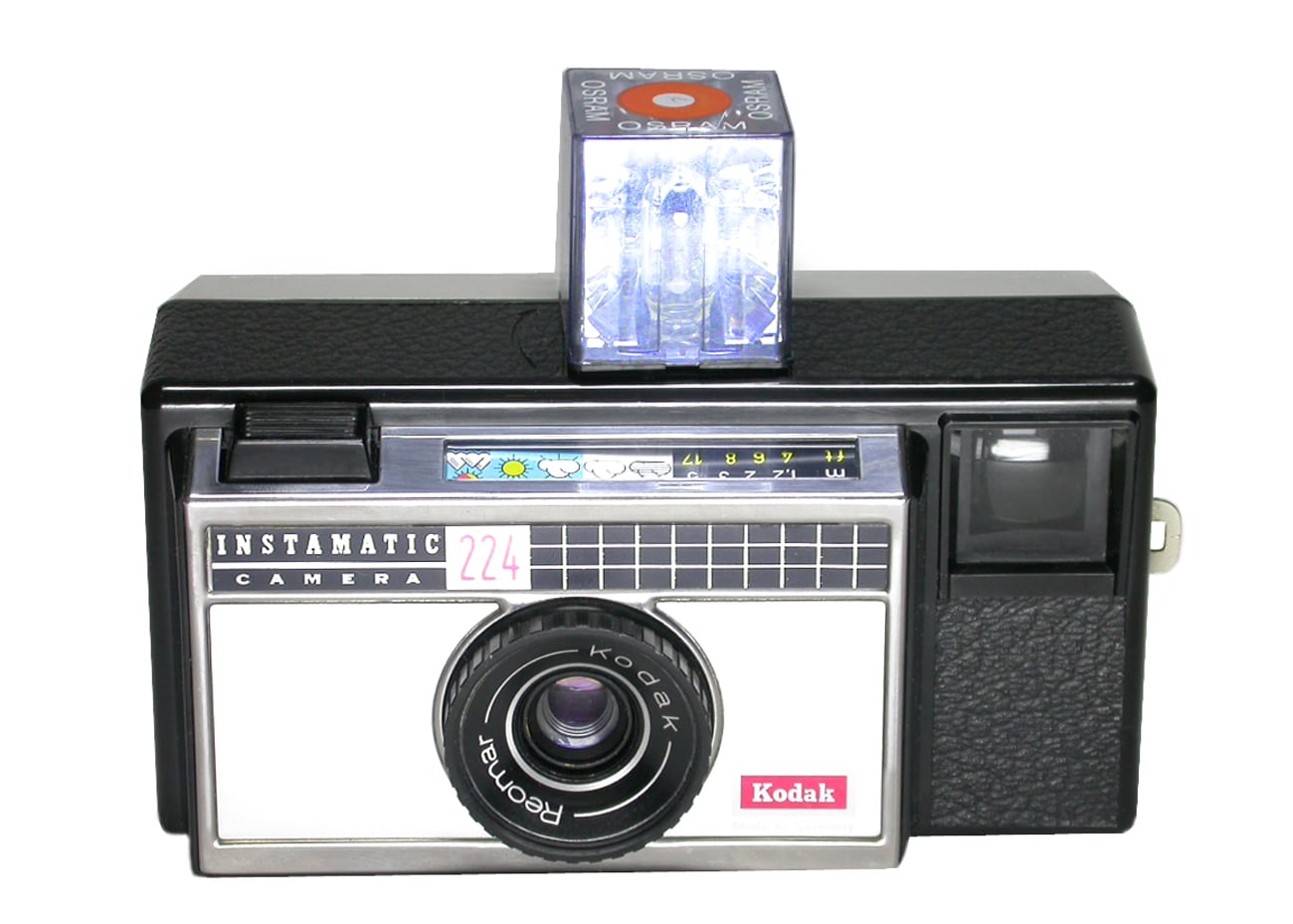 Eines von vielen Modellen der Instamatic-Serie für den Kassettenfilm 126 (Negativformat 28 x 28 mm): Die 224 wurde von 1965 bis 1968 in Deutschland gebaut. Objektiv: Kodak Reomar 1:5,6/38 mm, Einfachverschluss. Blitzwürfel-Anschluss. Das Gitter täuscht einen (nicht vorhandenen) Belichtungsmesser vor. Entfernungs- und Blendeneinstellung nach Symbolen.