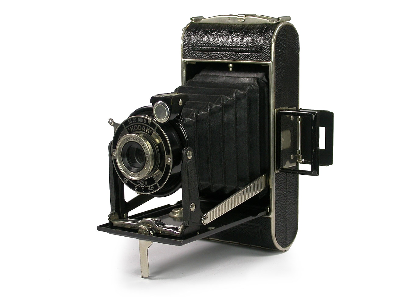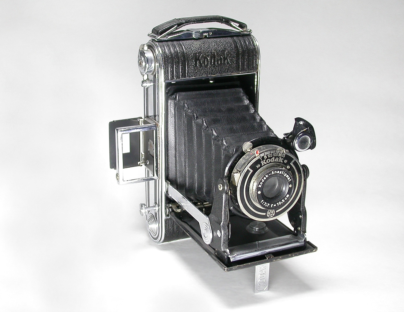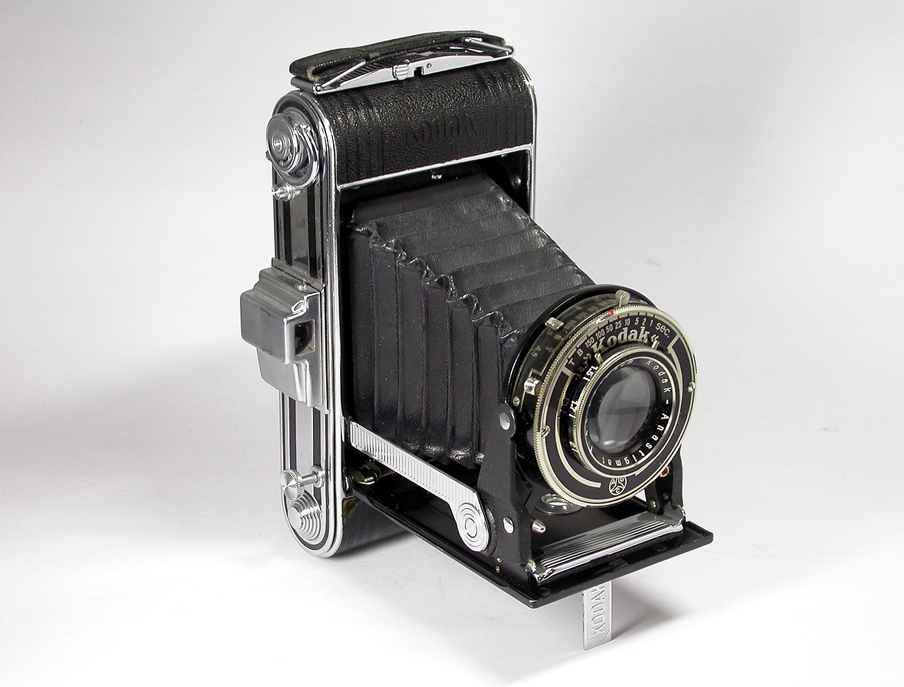 Klapp-/Spreizenkamera Kodak Junior 620 für den Rollfilm 620 (Negativformat 6 x 9 cm); hergestellt von 1937 bis 1939. Hier mit Objektiv Kodak-Anastigmat 1:7,7/10,5 cm, aufklappbarem Rahmen- sowie Brillantsucher und Verschlusszeiten bis 1/125 Sekunde. Dazu Gehäuse- und Selbstauslöser.