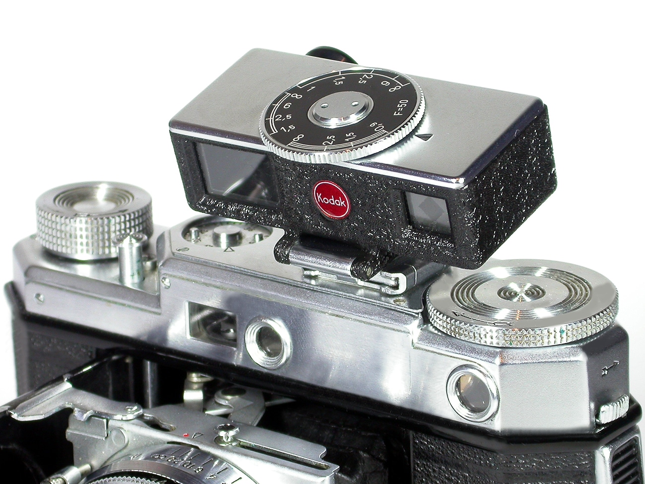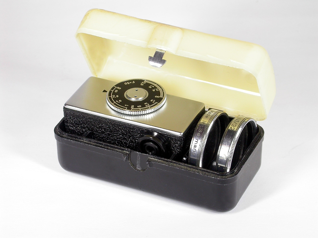 Ein Naheinstellgerät von Kodak: eine Kombination aus Sucher mit Parallaxenausgleich und Entfernungsmesser, für Objektive mit 45 mm Brennweite (trifft zum Beispiel auf die Kodak Retinette oder spätere Retinas zu). Dabei: Vorsatzlinsen N I/32 und N II/32, alles verstaut in einer Plastikbox.