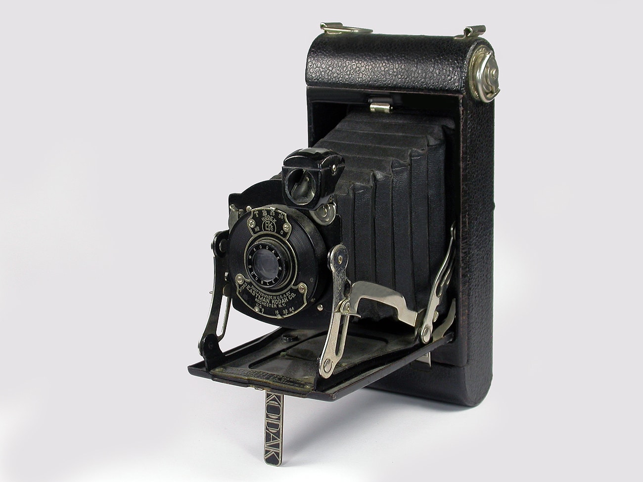 Klapp-/Spreizenkamera mit selbsttätigem Objektivauszug (gebaut von 1929 bis 1932 in den USA, von 1930 bis 1933 in England) für den Rollfilm 120 (Negativformat 6 x 9 cm). Hier mit Verschluss Kodak Kodex und mit Objektiv Kodak Doublet (1930-1931) für den Export. Ausführung für die USA mit farbigem Kunstlederbezug (schwarz, blau, braun oder grün), Ausführungen für England nur in schwarz, 1931 bis 1933 mit lederartig genarbtem Bezug. Hier die braune US-Version.