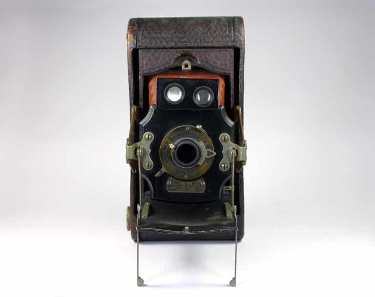Klapp-/Spreizenkamera (etwa 1899-1915) für Rollfilm 120 (Aufnahmeformat 6 x 9 cm). Rotbrauner Lederbalgen, Spreizenkonstruktion aus Messing, Fixfokus, Objektivstandarte aus Holz, zwei Brillantsucher, mechanischer Zentralverschluss B, T und Moment (I), drei Blendeneinstellungen, manuelle Belichtungssteuerung.