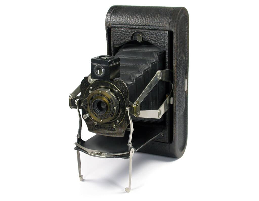 Klapp-/Spreizenkamera (etwa 1899-1915) für Rollfilm 120 (Aufnahmeformat 6 x 9 cm). Schwarzer Lederbalgen, Spreizenkonstruktion aus Messing, manuelle Scharfeinstellung, Objektivstandarte aus Holz, zwei Brillantsucher, mechanischer Zentralverschluss, manuelle Belichtungssteuerung. Hier eine Version mit schwarzem Lederbalgen, einer Objektivstandarte aus Metall und einer Spreizenkonstruktion aus vernickeltem Metall. Hier eine Version mit rotbraunem Balgen.