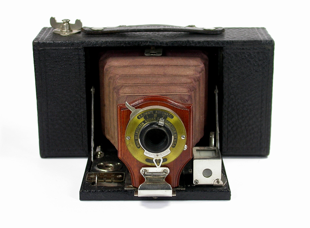 Klapp-/Laufbodenkamera (USA, 1905-1915) für den Rollfilm 124 (Negativformat: 8 x 10,5 cm). Achromatischer Meniskus, Spiegelsucher, Brownie-Automatic-Verschluss. Gehäuse aus Holz mit Kunstlederbezug. Objektivstandarte in Holz. Produziert in etwa 108.000 Exemplaren in vielen Variationen.